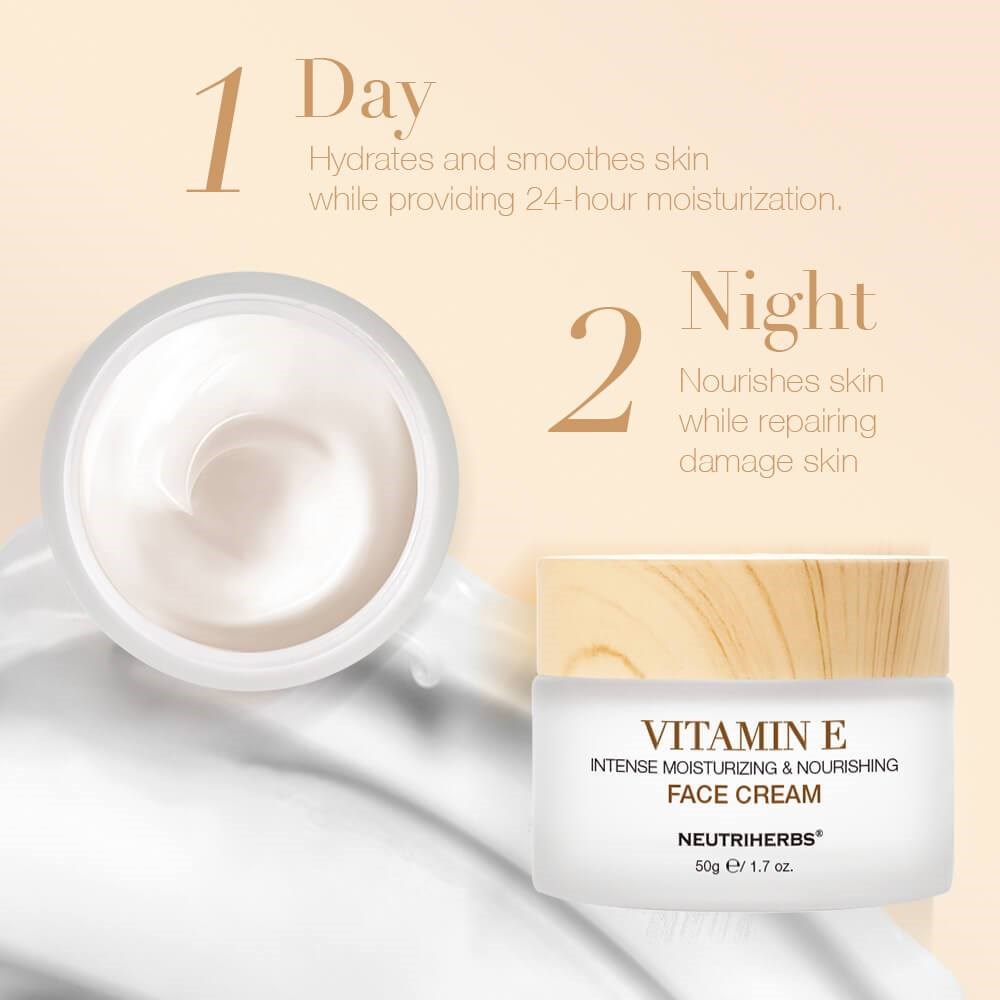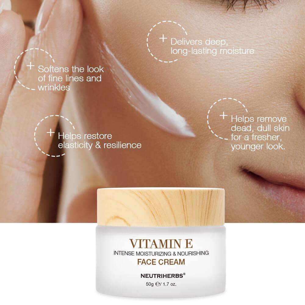Witamina E to rozpuszczalny w tłuszczach antyoksydant, który w pielęgnacji skóry stosuje się na wszystko, co związane z suchą skórą, egzemą i problemami skórnymi wywołanymi stanami zapalnymi. Badania pokazują, że octan tokoferylu (witamina E) może również częściowo chronić przed uszkodzeniami słonecznymi, dzięki swoim unikalnym właściwościom naprawczym. Wszystkie typy skóry korzystają z witaminy E, która jest idealna dla suchej skóry, wzmacnia odporność skóry, zapobiega zmarszczkom i chroni skórę. Dlatego często dodaje się witaminę E do produktów po opalaniu oraz do kosmetyków na rozstępy i blizny. Neutriherbs Vitamin E Intense Moisturizing & Nourishing Face Cream jest odpowiednia dla wszystkich typów skóry i doskonała dla młodej do średnio zaawansowanej skóry, która potrzebuje czegoś więcej niż tylko zwykłego nawilżenia, ale jeszcze nie produktów przeciwstarzeniowych.