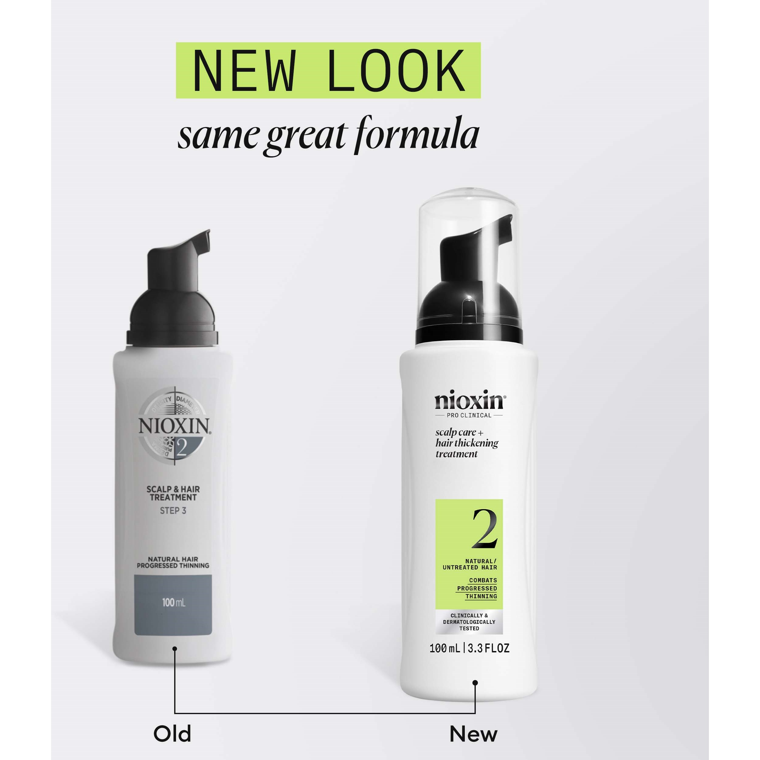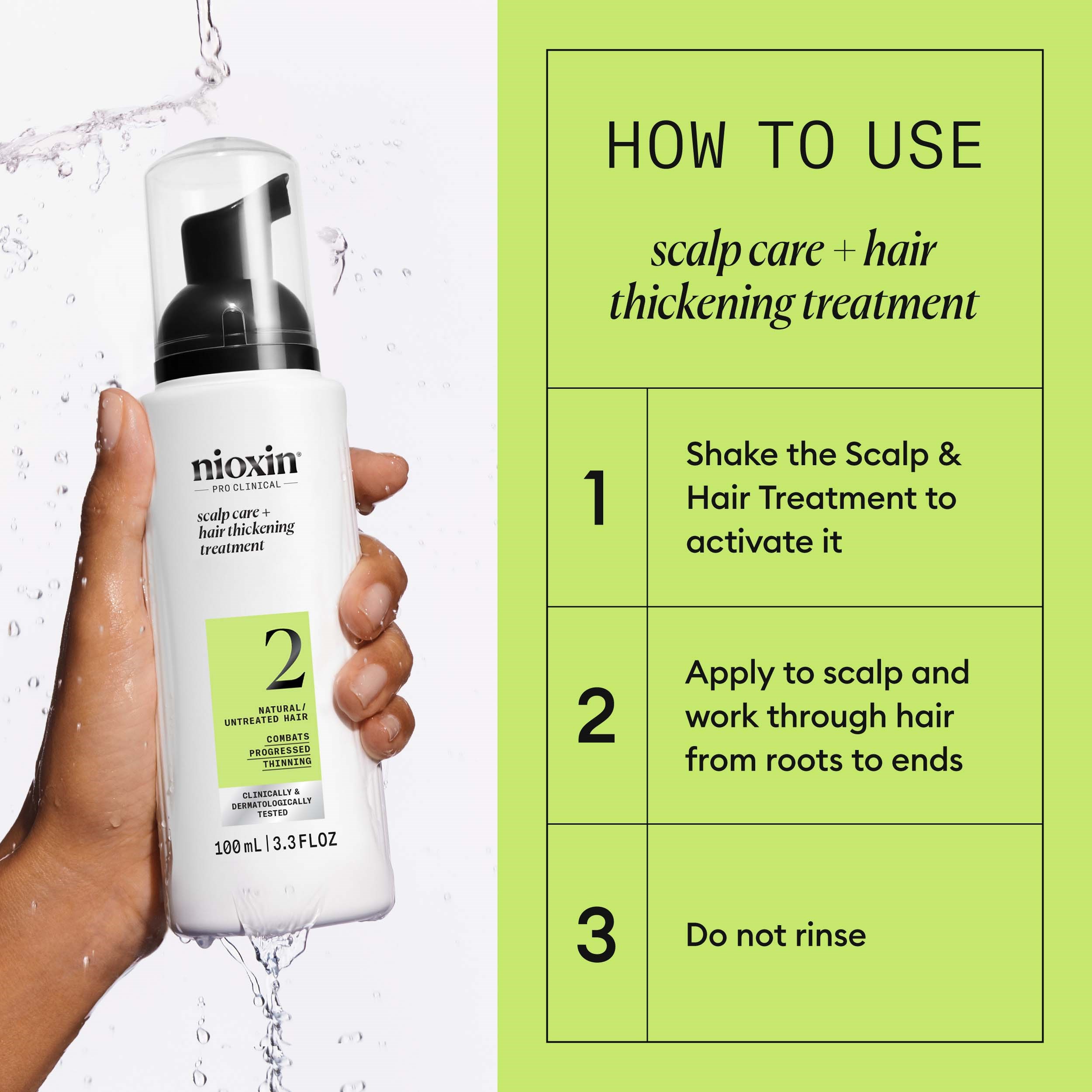 Nioxin System 2 Scalp & Hair Treatment dla naturalnych włosów z postępującym przerzedzeniem to ostatni krok w trzyetapowej pielęgnacji Nioxin, który wzmacnia strukturę włosów i zapobiega ich łamaniu. Ta nadająca objętość odżywka bez spłukiwania sprawia, że włosy wyglądają na grubsze, odświeżając skórę głowy i zwiększając objętość każdego włosa. Nioxin Scalp Treatment stymuluje wzrost włosów dzięki zwiększonemu krążeniu krwi, co może powodować chwilowe zaczerwienienie i uczucie ciepła podczas aplikacji. Stosuj razem z Nioxin System 2 Cleanser Shampoo i Nioxin System 2 Conditioner, aby uzyskać najlepsze rezultaty. Sposób użycia:1. Dobrze wstrząśnij. 2. Nałóż produkt równomiernie na wilgotne włosy i skórę głowy. Użyj do dziewięciu pompek produktu.3. Wmasuj i przeczesz. 4. Nie spłukuj. Stylizuj jak zwykle.