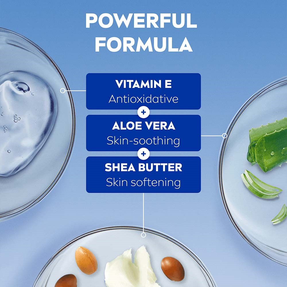 – Lekka formuła- Do twarzy, ciała i rąk- Z witaminą E, masłem shea i aloesem- Odpowiedni dla wszystkich rodzajów skóry- 94% składników pochodzenia naturalnego* *Składniki pochodzenia naturalnego, które zachowują ponad 50% naturalnego stanu po przetworzeniu, w tym woda.Intensywnie odżywia skórę przez 48 godzin bez uczucia tłustości. Idealny do codziennego użytku, odpowiedni dla wszystkich rodzajów skóry. Zawiera masło shea znane z właściwości nawilżających i aloes, który koi i nawilża. Dodatkowo wzbogacony witaminą E, chroni skórę przed wolnymi rodnikami i negatywnym wpływem środowiska. Odpowiedni do twarzy, ciała i rąk. Podaruj swojej skórze pielęgnację, na jaką zasługuje. Sposób użycia: 1. Stosuj codziennie na twarz, ciało i ręce. Delikatnie wmasuj w skórę.