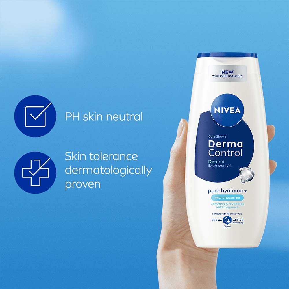 – Czysty kwas hialuronowy i prowitamina B5- Delikatnie oczyszcza skórę- Neutralne pH- Zachowuje naturalne nawilżenie- Dla dodatkowego komfortuNIVEA Derma Control Defend Shower to żel pod prysznic, który odświeża skórę każdego dnia! Formuła z czystym kwasem hialuronowym i prowitaminą B5 aktywnie działa, aby zachować naturalne nawilżenie i chroni przed wysuszeniem. Delikatnie oczyszcza skórę, nie usuwając jej naturalnych olejków, co sprawia, że jest idealny dla wrażliwej skóry. Wspiera odporność skóry na podrażnienia i koi. Zapewnia natychmiastowo miękką i odświeżoną skórę. Formuła o łagodnym i przyjemnym zapachu, z neutralnym pH, przyjazna dla skóry, przebadana dermatologicznie, to świetny wybór do codziennego użytku. Sposób użycia: 1. Weź prysznic i dokładnie zwilż skórę2. Nałóż żel na całe ciało3. Wmasuj żel w skórę4. Dokładnie spłucz przed wytarciem