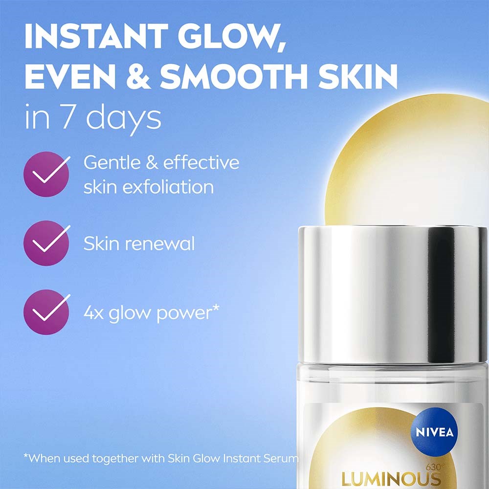 – Natychmiastowy efekt glow- Delikatne i skuteczne złuszczanie- 4% kwasów AHA + 1% kwasów PHA + aloes- Po 7 dniach: wyrównana i gładka skóra- Klinicznie potwierdzona skuteczność- Unikalna, ultraskuteczna formuła jest lekka i szybko się wchłaniaNIVEA Exfoliator Luminous630 Skin Glow Daily Liquid 100 ml to peeling bez spłukiwania, który działa dogłębnie, zapewniając niesamowity blask. 1. Wyrównuje koloryt skóry w 7 dni, 2. Natychmiast zmniejsza pory i wyrównuje koloryt, 3. Odnawia skórę dzięki 4% kwasów AHA i 1% kwasów PHA. Skuteczna formuła jest lekka i szybko się wchłania. Podwójny efekt: natychmiastowe rozświetlenie, a przy długotrwałym stosowaniu zdrowa i równomierna cera. Produkt przebadany dermatologicznie. Odpowiedni dla wszystkich rodzajów skóry, w tym wrażliwej. Stosuj raz dziennie z wacikiem lub dłońmi na dobrze oczyszczoną twarz. Nie spłukuj.Uwaga: Może wystąpić lekkie mrowienie. Nie stosuj na podrażnioną skórę; przerwij stosowanie w przypadku podrażnienia; skonsultuj się z lekarzem, jeśli podrażnienie nie ustąpi; unikaj kontaktu z oczami. Produkt zawiera kwasy AHA, które mogą zwiększyć wrażliwość skóry na słońce i ryzyko oparzeń słonecznych. Stosuj krem z filtrem i unikaj słońca podczas stosowania produktu i tydzień po jego zakończeniu. Sposób użycia: 1. Stosuj raz dziennie z wacikiem lub dłońmi na dobrze oczyszczoną twarz. Nie spłukuj.2. Połącz z EVEN GLOW Instant Glow Serum dla jeszcze większego efektu glow.