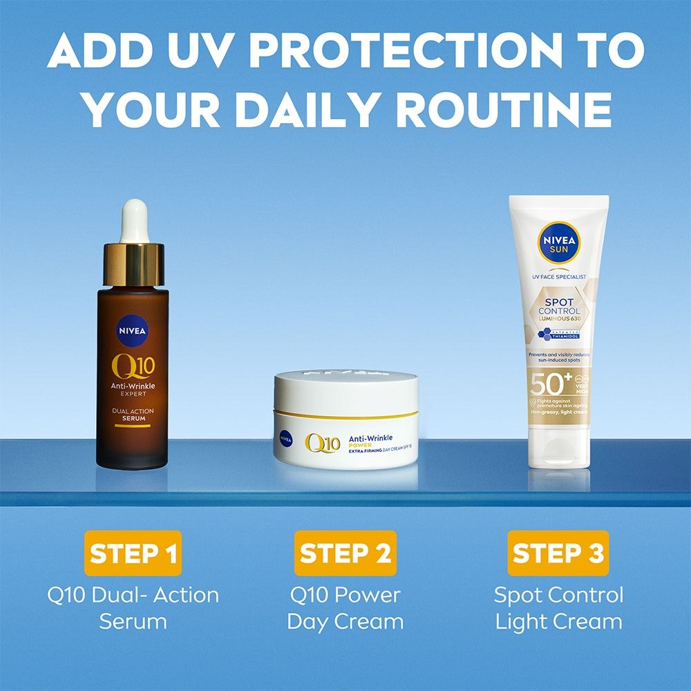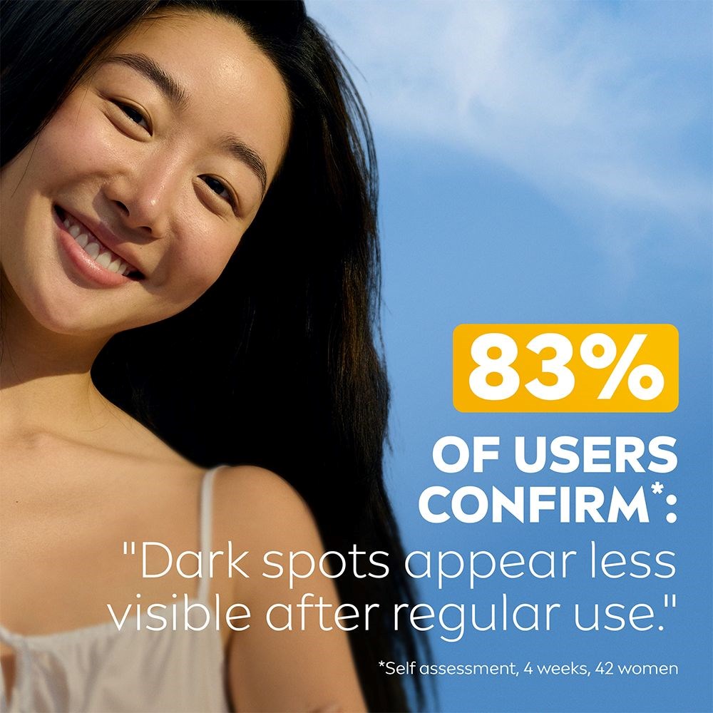 – Krem przeciwsłoneczny do twarzy z SPF 50+- Ochrona przeciwsłoneczna z LUMINOUS630- Widocznie redukuje przebarwienia posłoneczne- Natychmiastowa ochrona przed promieniowaniem UVA/UVB- Idealny do codziennego stosowaniaNIVEA UV Face Luminous630 Dark Spot Control SPF 50+ to krem przeciwsłoneczny do twarzy, szyi i dekoltu, który zapewnia bardzo wysoką ochronę przeciwsłoneczną. Produkt został specjalnie opracowany z myślą o delikatniejszej skórze twarzy i natychmiastowo chroni ją przed promieniowaniem UV. Wzbogacony opatentowanym składnikiem LUMINOUS 630, który skutecznie zwalcza przebarwienia spowodowane słońcem, starzeniem się oraz czynnikami hormonalnymi, takimi jak ciąża i menopauza. Widoczne rezultaty już po 4 tygodniach. Ten krem przeciwsłoneczny do twarzy jest odpowiedni dla wszystkich typów skóry, w tym wrażliwej. Lekka i nietłusta formuła jest wzbogacona o kwas hialuronowy i witaminę E, co zapewnia orzeźwiający efekt i miękkie uczucie na skórze, co czyni go idealnym do codziennego stosowania. Formuła jest w 65% biodegradowalna i przyjazna dla oceanów, ponieważ nie zawiera filtrów UV: oktinoksatu, oksybenzonu i oktokrylenu. Opakowanie wykonane jest z kartonu certyfikowanego przez FSC Mix, a tuba i nakrętka z 50% plastiku z recyklingu. Testowany dermatologicznie.Sposób użycia:Aplikuj obficie, szczególnie po kąpieli/poceniu się/osuszeniu ręcznikiem. Ilość dla dorosłego to 3 ml na aplikację na twarz. Zbyt mała ilość produktu zmniejsza poziom ochrony. Nie przebywaj zbyt długo na słońcu. Nadmierna ekspozycja na słońce stanowi zagrożenie dla zdrowia. Chroń niemowlęta i małe dzieci przed bezpośrednim działaniem promieni słonecznych. Unikaj kontaktu z oczami. Pozwól na całkowite wchłonięcie. Unikaj kontaktu z tkaninami i twardymi powierzchniami, aby uniknąć plam. Noś odzież ochronną i stosuj wystarczającą ilość ochrony przeciwsłonecznej na odkryte części ciała. Aplikuj produkty z LUMINOUS630® maksymalnie 4 razy dziennie. Dla najlepszych rezultatów, używaj również serii NIVEA LUMINOUS630® Anti Dark Spot. Poddaj tubę recyklingowi jako plastik.