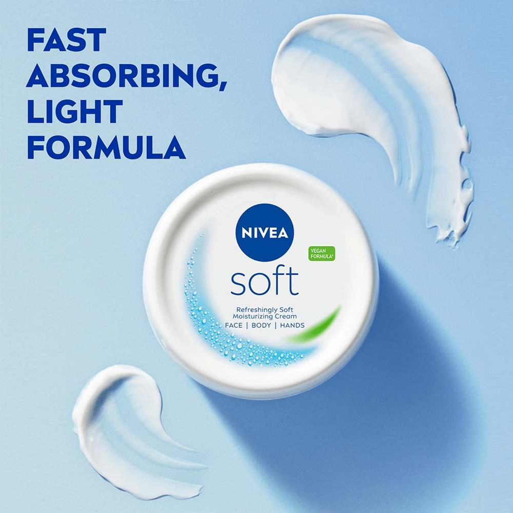 -48 godzin nawilżenia-Krem do skóry, który pozostawia skórę miękką i odświeżoną-Szybko się wchłania-Wegańska formuła – bez składników pochodzenia zwierzęcego-Do codziennego użytkuNIVEA Soft to intensywnie nawilżający krem do codziennego użytku. Lekka formuła z witaminą E i 100% naturalnym olejem jojoba zapewnia 48 godzin intensywnego nawilżenia, które szybko się wchłania. Krem nawilżający można stosować na ciało, dłonie i twarz, a jego formuła pasuje do wszystkich typów skóry. NIVEA Soft jest w 100% neutralna pod względem klimatycznym (kompensacja pozostałych emisji poprzez certyfikowane projekty klimatyczne) i ma wegańską formułę – bez składników pochodzenia zwierzęcego. Ten produkt NIVEA jest dermatologicznie testowany. Ciesz się tym odświeżającym kremem z kultowym zapachem NIVEA! Efekt, który możesz poczuć i zobaczyć: NIVEA Soft 300 ml. Używaj codziennie na twarzy, ciele i dłoniach. Ponownie aplikuj na szczególnie suche miejsca. Recykluj jako opakowanie plastikowe, gdy produkt się skończy.Sposób użycia:Aplikuj codziennie na twarz, ciało i dłonie. Delikatnie wmasuj w skórę. Unikaj kontaktu z oczami.