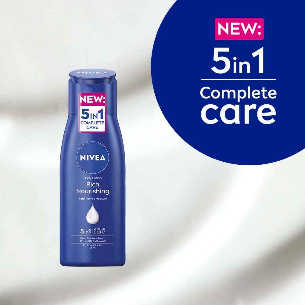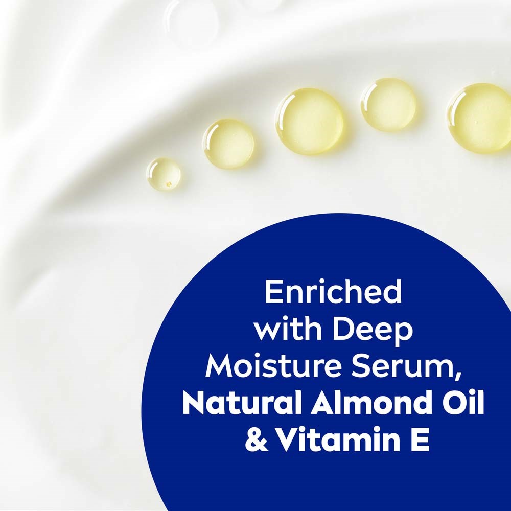 Odżywcze mleczko do ciała NIVEA Rich Nourishing jest wypełnione SERUM NIVEA DEEP MOISTURE, naturalnym olejkiem migdałowym i witaminą E. Opatentowana formuła NIVEA wykorzystuje wiedzę, że nasza skóra zawiera wystarczającą ilość wilgoci w swoich głębszych warstwach.
