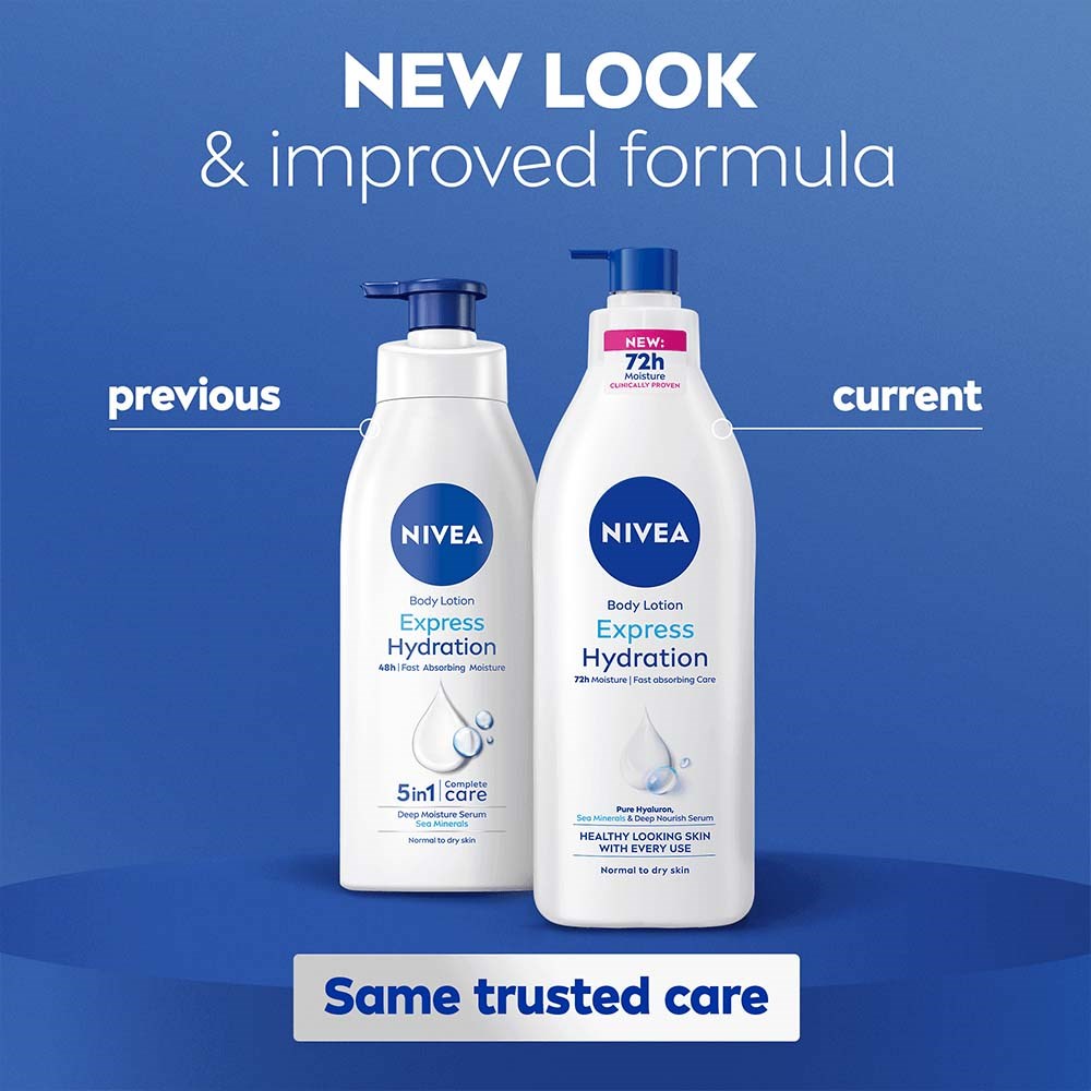 NIVEA Express Hydration Balsam do ciała zapewnia Twojej normalnej i suchej skórze nawilżenie i pielęgnację, których potrzebuje i na które zasługuje. Formuła z Minerałami Morskimi dostarcza Ci nawilżenia – przez cały dzień.
