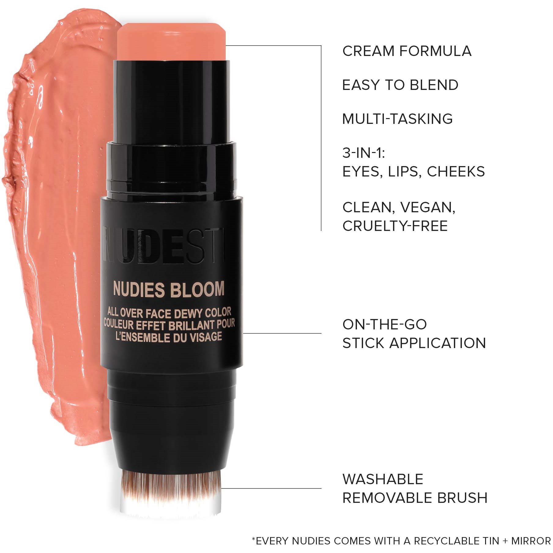 NUDIES BLOOM to przyjazny dla skóry, świeży róż, który nadaje policzkom, oczom i ustom piękny kolor. Efekt? Bardzo delikatny i świeży wygląd. Produkt dostępny w czterech półprzezroczystych i rozświetlających odcieniach, które pasują do wszystkich tonacji skóry. Wyprodukowany w Korei na bazie innowacyjnej formuły pielęgnacyjnej. W zestawie poręczny pędzelek do nakładania produktu. Sposób użyci: Sposób użycia:1. Stosuj bezpośrednio na skórę, nakładając NUDIES BLOOM ALL-OVER FACE DEWY COLOR na policzki,a następnie rozetrzyj produkt pędzlem do blendowania lub palcami.2. Nałóż produkt na powieki i usta.3. Stosuj na makijaż o średnim lub pełnym kryciu: Nabierz produkt na palce lub pędzel, a następnie nałóż na policzki i wklep.4. Rozetrzyj na powiekach i ustach.* Przeciągnij pędzlem po sztyfcie, a następnie nałożyć bezpośrednio na twarz.