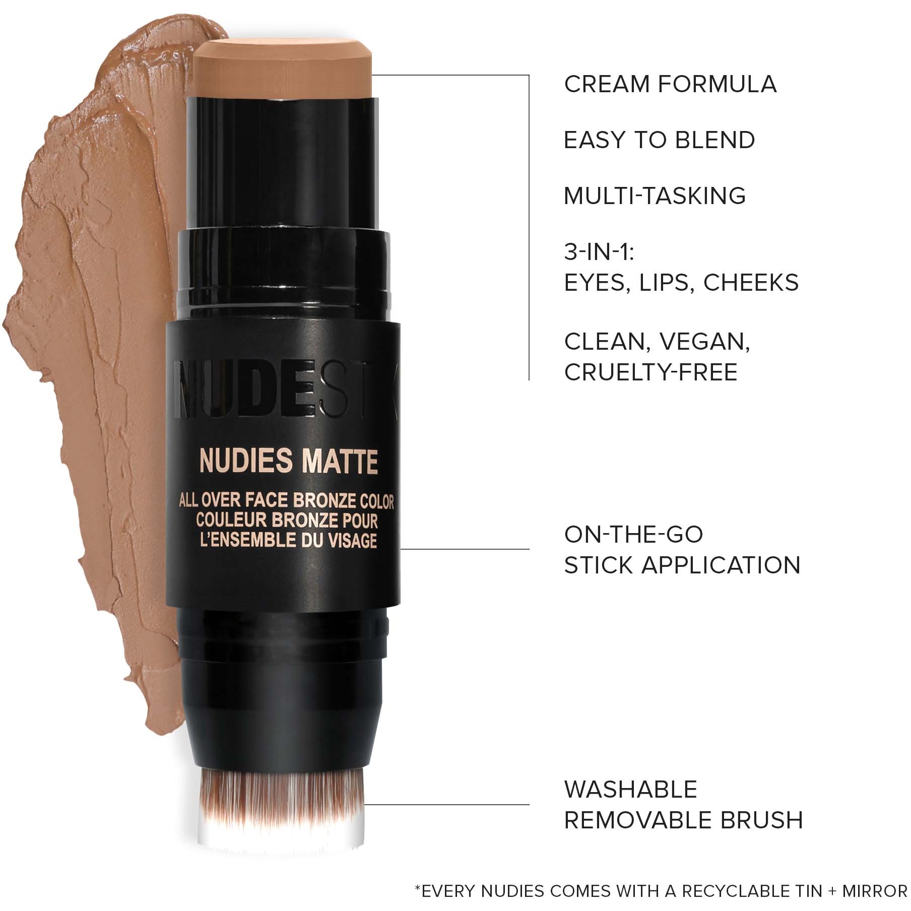 Wielozadaniowy bronzer w sztyfcie o kremowej konsystencji do tworzenia ciepłego konturowania twarzy, oczu i ust. Z tym produktem w łatwy i szybki sposób uzyskasz efekt #gonudebutbetter.Praktyczny pędzel do blendowania dołączony do zestawu umożliwia aplikację w podróży! Sposób użyci: Sposób użycia:1. Stosuj bezpośrednio na skórę, nakładając NUDIES MATTE ALL-OVER FACE BRONZE COLOR pod kości policzkowymi, na czoło, nos i brodę, a następnie rozetrzyj produkt pędzlem do blendowania lub palcami.2. Nałóż produkt na powieki i usta, by uzyskać efekt muśniętej słońcem twarzy.3. Stosuj na makijaż o średnim lub pełnym kryciu: Nabierz produkt na palce lub pędzel, a następnie nałóż na pod kości policzkowymi, na czoło, nos i brodę i wklep go w skórę.4. Rozetrzyj na powiekach i ustach, by uzyskać efekt muśniętej słońcem twarzy.