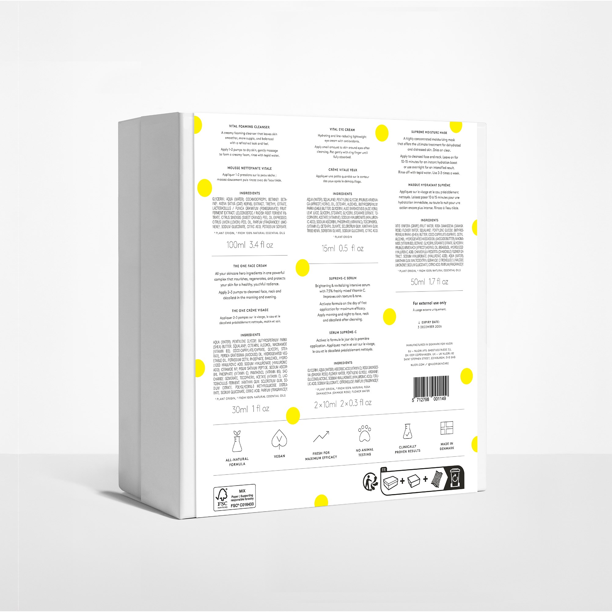 ULTYMATYWNA NATURALNA PIELĘGNACJAZ 5 PRODUKTAMI – DLA WSZYSTKICH RODZAJÓW CERYOdkryj najlepszą rutynę pielęgnacyjną z widocznymi efektami. Bestsellerowa kolekcja to dekada innowacji w naturalnej pielęgnacji, stworzona, by zapewnić widoczne rezultaty dla wszystkich rodzajów cery.Zawartość:Ten ekskluzywny zestaw zawiera 5 pełnowymiarowych produktów starannie dobranych, by stworzyć kompletną i skuteczną rutynę dla zdrowszej i promiennej skóry. Każdy produkt wykonany jest z potężnych, świeżo zmieszanych formuł, aby zapewnić maksymalny efekt i niezrównaną czystość.Sposób użycia:VITAL FOAMING CLEANSERNałóż 1–2 pompki na suchą skórę, delikatnie wmasuj, aż do powstania kremowej piany, spłucz letnią wodą.THE ONE FACE CREAMNałóż 2–3 pompki na oczyszczoną twarz, szyję i dekolt rano i wieczorem.VITAL EYE CREAMNałóż obfitą warstwę na czystą, suchą skórę. Pozostaw na 15 min. Spłucz letnią wodą. Stosuj 2–3 razy w tygodniu.SUPREME-C SERUMAktywuj formułę w dniu pierwszej aplikacji, aby uzyskać maksymalny efekt. Stosuj rano i wieczorem na twarz, szyję i dekolt po oczyszczeniu.SUPREME MOISTURE MASKNałóż na oczyszczoną twarz i szyję. Pozostaw na 10–15 min, aby natychmiast nawilżyć, lub użyj na noc, aby wzmocnić efekt. Spłucz letnią wodą. Stosuj 2–3 razy w tygodniu.