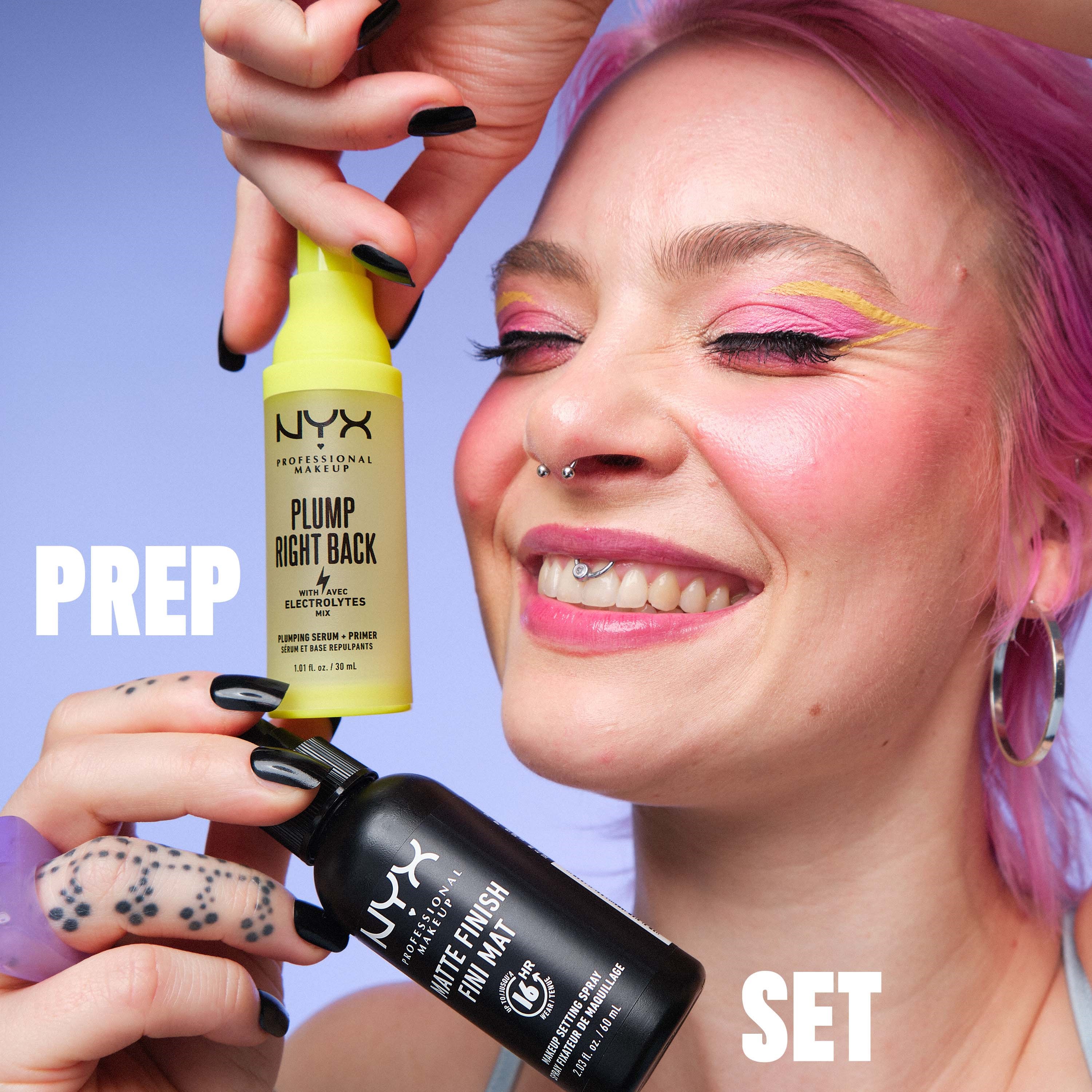 NYX PROFESSIONAL MAKEUP Matte Finish, Makeup Setting Spray 01 MatteŻądaj perfekcji! Makeup Setting Spray to gwarancja świeżego wyglądu przez długie godziny. Nasze spraye utrwalające są lekkie i przyjemne, ale jednocześnie ciężko pracują na skórze, żeby twój makijaż utrzymał się jak najdłużej. Dostępne w wersji matowej Matte Shine-Free Finish albo Dewy Fresh Glow, która daje świeży efekt błyszczącej skóry.60 mlNYX PROFESSIONAL MAKEUP Plump Right Back Primer + Serum – Baza-serum pod makijaż Plump Right Back Primer + Serum od NYX Professional Makeup błyskawicznie wyrównuje skórę, zapewniając jednolitą bazę pod makijaż. Skóra jest nawilżona i sprężysta z poczuciem świeżości. Wzbogacony o 3 rodzaje elektrolitów + 2 rodzaje witamin (kwas hialuronowy, witamina E, prowitamina B5, magnez i potas), ten super-primer-serum pozostawia skórę intensywnie nawilżoną i wyglądającą na bardziej jędrną – jednocześnie przedłużając trwałość makijażu, aby trwał cały dzień. Wegańska formuła jest lekka i szybko się wchłania, dzięki czemu skóra jest gotowa na makijaż. *Nie zawiera składników pochodzenia zwierzęcego.30 ml