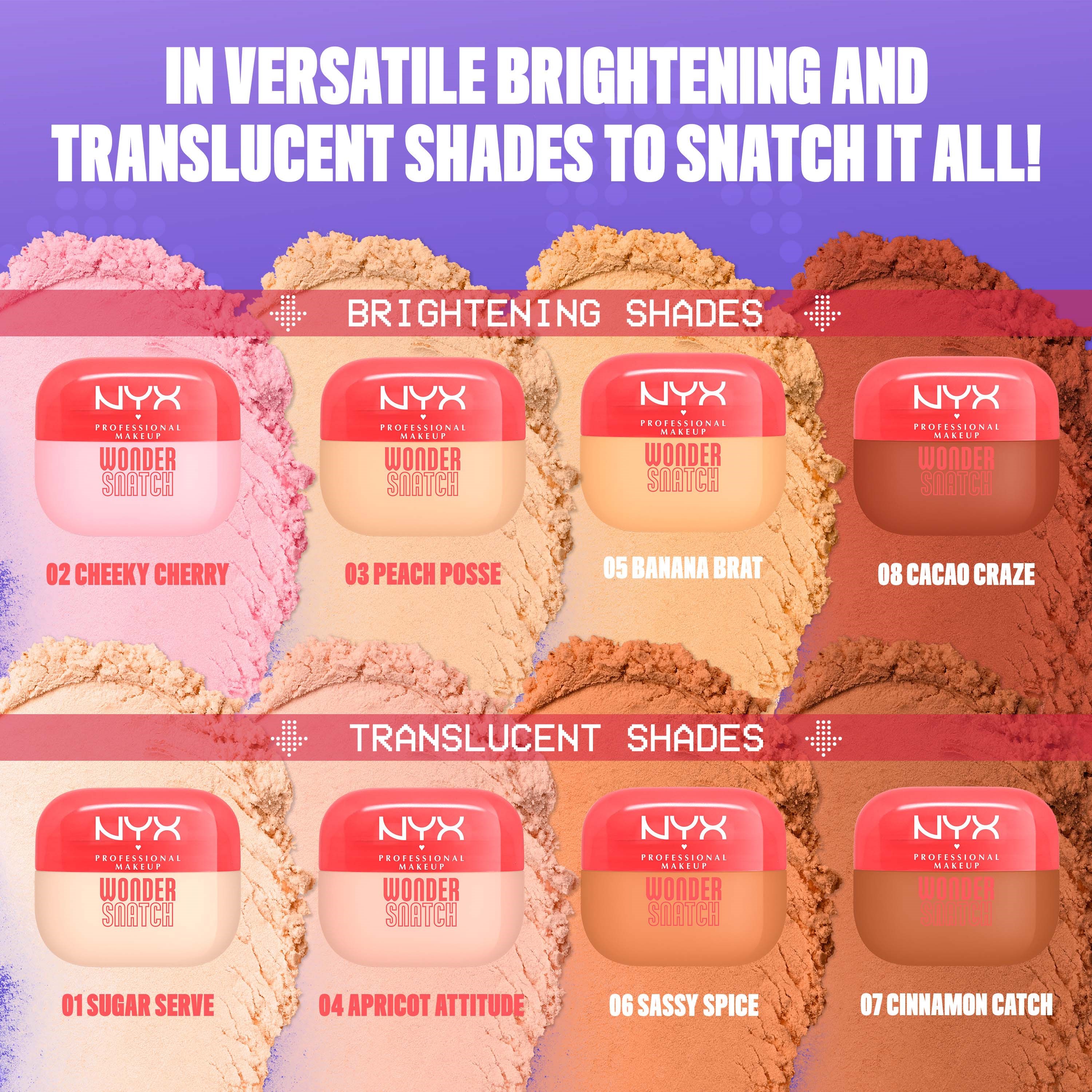 NYX Professional Makeup Wonder Snatch Powder to sekret nieskazitelnego looku. Stworzony, by utrwalić makijaż, dodać twarzy blasku i zapewnić efekt do 16 godz. Zaawansowana technologia pudru z zieloną herbatą i peptydami pełnymi antyoksydantów sprawia, że pigmenty idealnie wtapiają się w skórę, dając naturalny efekt z pięknym blaskiem. Formuła nie obciąża i nie tworzy efektu ciastka, a makijaż pozostaje na miejscu przez cały dzień. Przenieś swój makijaż na wyższy poziom!- Utrzymuje się do 16 godz.- Z zieloną herbatą i peptydami.- Odporny na pot i rozmazywanie.- Nie obciąża i nie wysusza.- Wegańska formuła**Bez składników pochodzenia zwierzęcegoSposób użycia:Utrwal makijaż, nakładając cienką warstwę pudru pod oczami, w strefie T, na brodzie i pod kośćmi policzkowymi. Nałóż obficie i pozostaw na chwilę, a następnie strzep nadmiar.