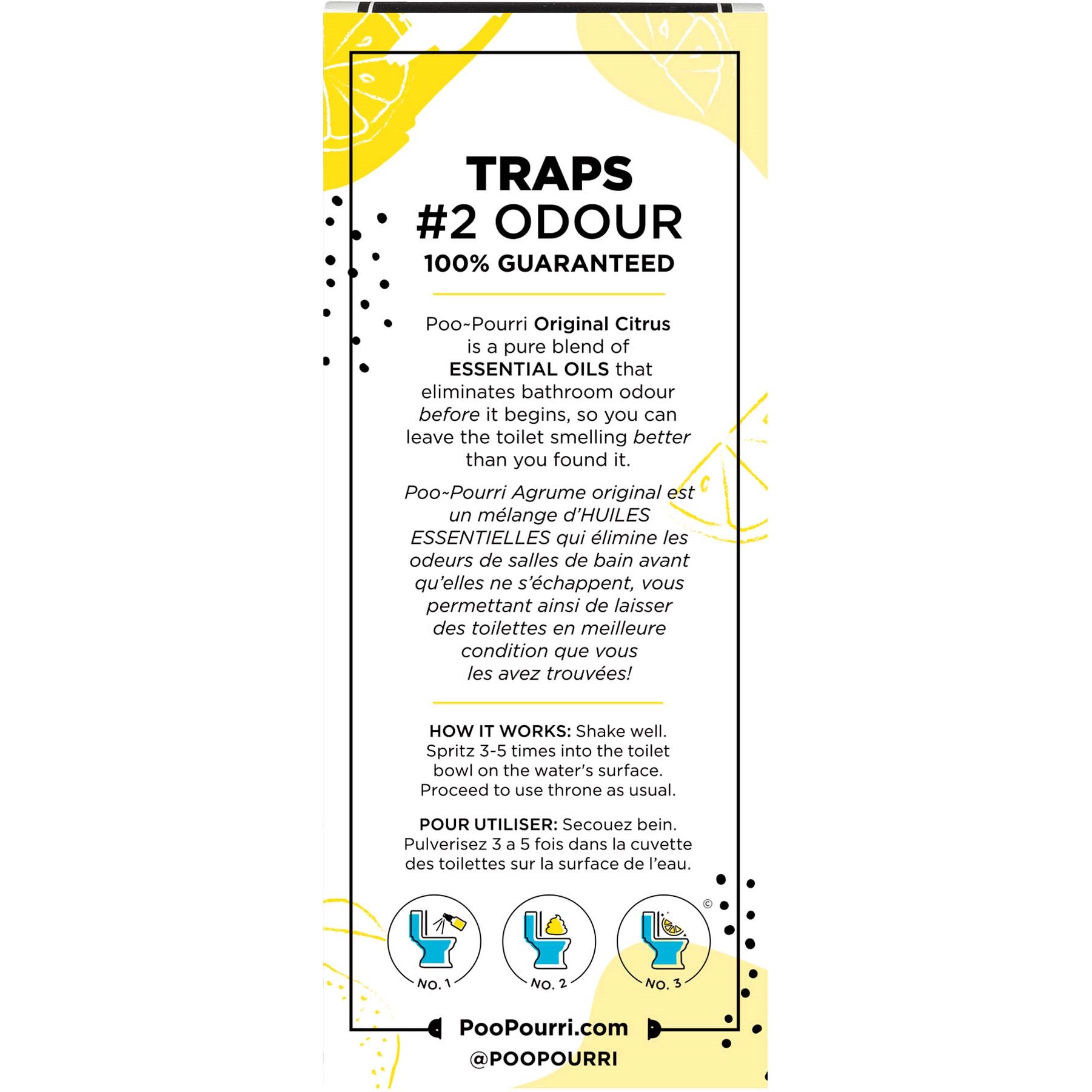 Spray do toalety POO~POURRI Before-You-Go ma opatentowaną formułę, która tworzy ochronną barierę na powierzchni wody. Bariera ta została zaprojektowana tak, aby nie przepuszczać niechcianych zapachów do powietrza. Poo~Pourri wykorzystuje naturalne olejki eteryczne i robi więcej niż tylko poprawia jakość powietrza – jest również przyjazny dla środowiska. Sekretna mieszanka opiera się na olejkach eterycznych, które eliminują nieprzyjemne zapachy w łazience, co sprawia, że jest to bezpieczne do wdychania i spłukiwania. Z butelką Poo~Pourri w torebce to, co robisz w łazience, to tylko Twoja sprawa.Nasza najpopularniejsza nuta zapachowa! Original Citrus to orzeźwiający zapach cytryny, bergamotki i trawy cytrynowej.Sposób użycia:Dobrze wstrząśnij butelką. Spryskaj 3-5 razy bezpośrednio do toalety nad powierzchnią wody. Korzystaj z toalety jak zwykle.