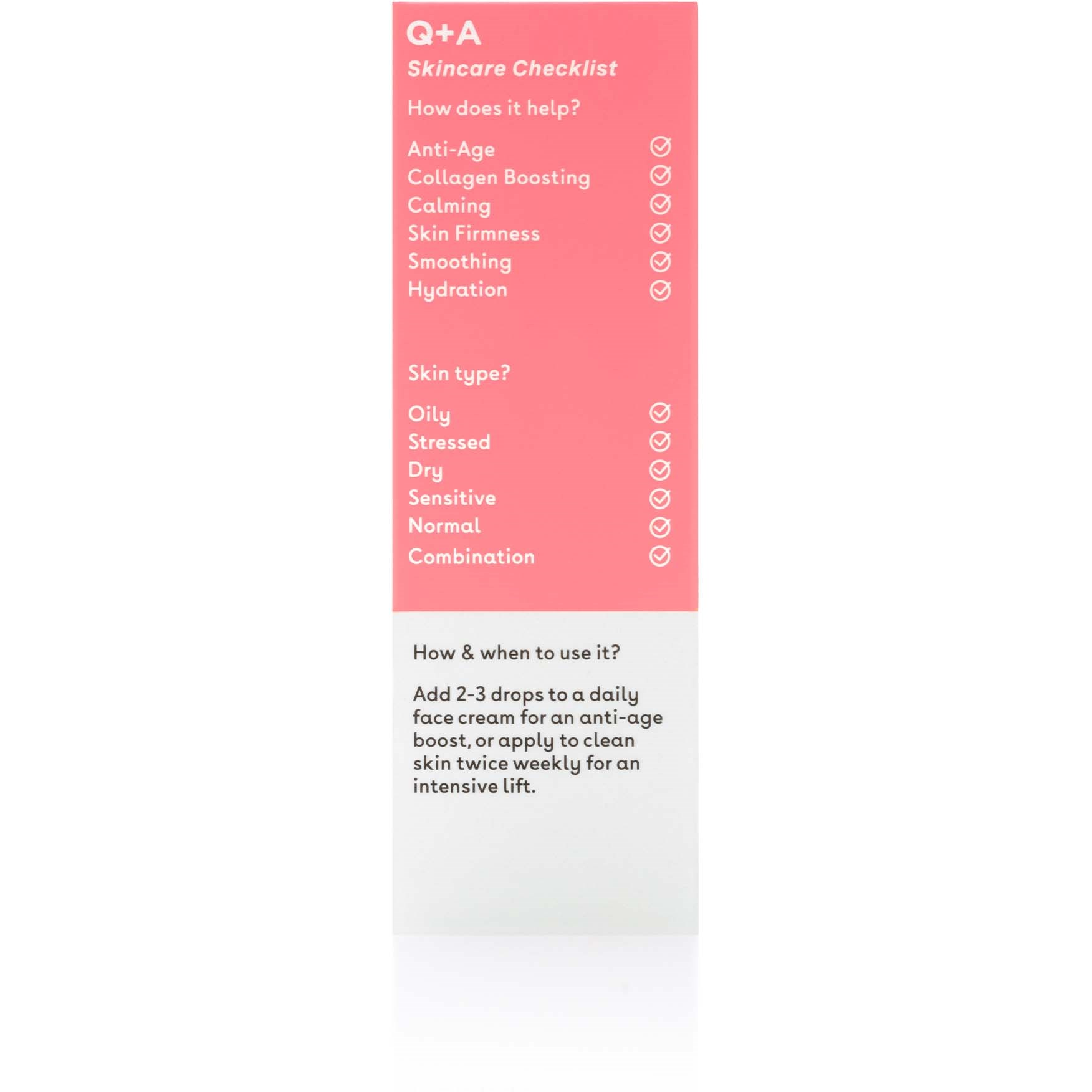 Sposób użycia:Dodaj 2-3 krople do kremu do twarzy dla dodatkowego efektu anti-age lub aplikuj na czystą skórę 2 razy w tygodniu dla intensywnego liftingu.