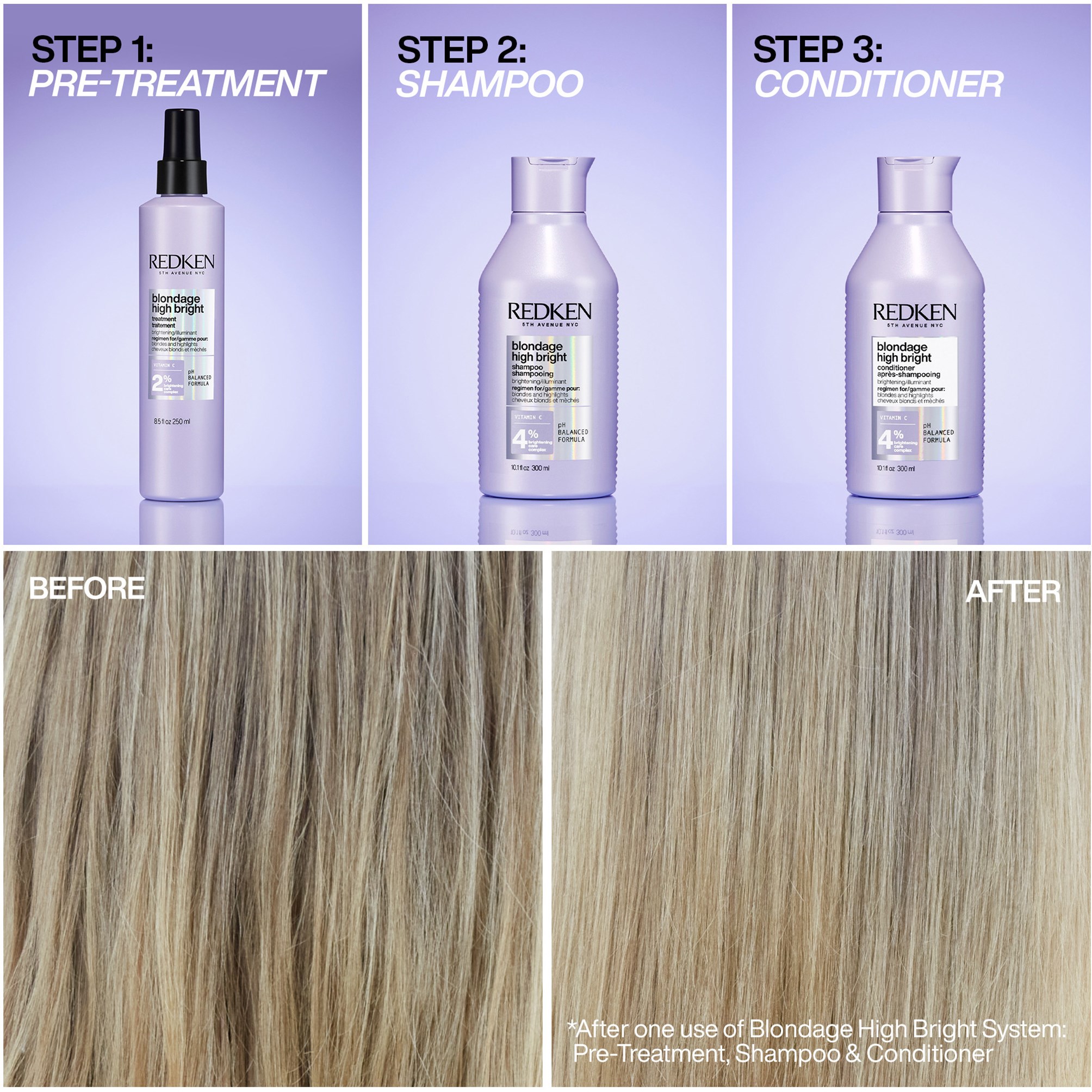 Szampon Redken Blondage High Bright rozjaśnia, oczyszcza i ożywia blond włosy, które stały się matowe lub pozbawione życia. Uzyskaj natychmiastowy efekt jaśniejszych włosów* i ciesz się ich miękkością oraz czystością. Jako część naszej rutyny High Bright, ten rozświetlający szampon pomaga utrzymać włosy lśniące i zadbane. Blondage High Bright jest wzbogacony o witaminę C oraz nasz kompleks Brightening Care, aby natychmiastowo rozjaśnić włosy!* Idealny dla wszystkich rodzajów farbowanych, pasemkowanych lub naturalnych blond włosów, Blondage High Bright sprawia, że Twoje blond włosy pozostają jasne i klarowne między wizytami w salonie. *Ocena ekspertów przeprowadzona na 53 modelkach po użyciu szamponu, odżywki i kuracji z serii. Redken stawia na zrównoważony rozwój i inkluzyjność. Opakowania produktów do pielęgnacji włosów Redken są recyklingowalne i składają się z maksymalnie 93% plastiku z recyklingu.Sposób użycia:Nałóż na wilgotne włosy, wmasuj, a następnie spłucz. Następnie nałóż odżywkę Redken Blondage High Bright. Natychmiastowe rezultaty będą się tylko poprawiać przy regularnym stosowaniu – im więcej używasz, tym lepsze będą efekty!* W razie kontaktu z oczami natychmiast spłucz. Należy stosować aż do osiągnięcia pożądanej jasności. Gdy osiągniesz pożądaną jasność, przestań stosować kurację i wybierz jedną z opcji: 1. Kontynuuj używanie tylko szamponu i odżywki, lub 2. Zastąp ją swoją ulubioną parą od Redken. *Test konsumencki przeprowadzony na 78 kobietach po 4 tygodniach stosowania szamponu, odżywki i kuracji z serii.