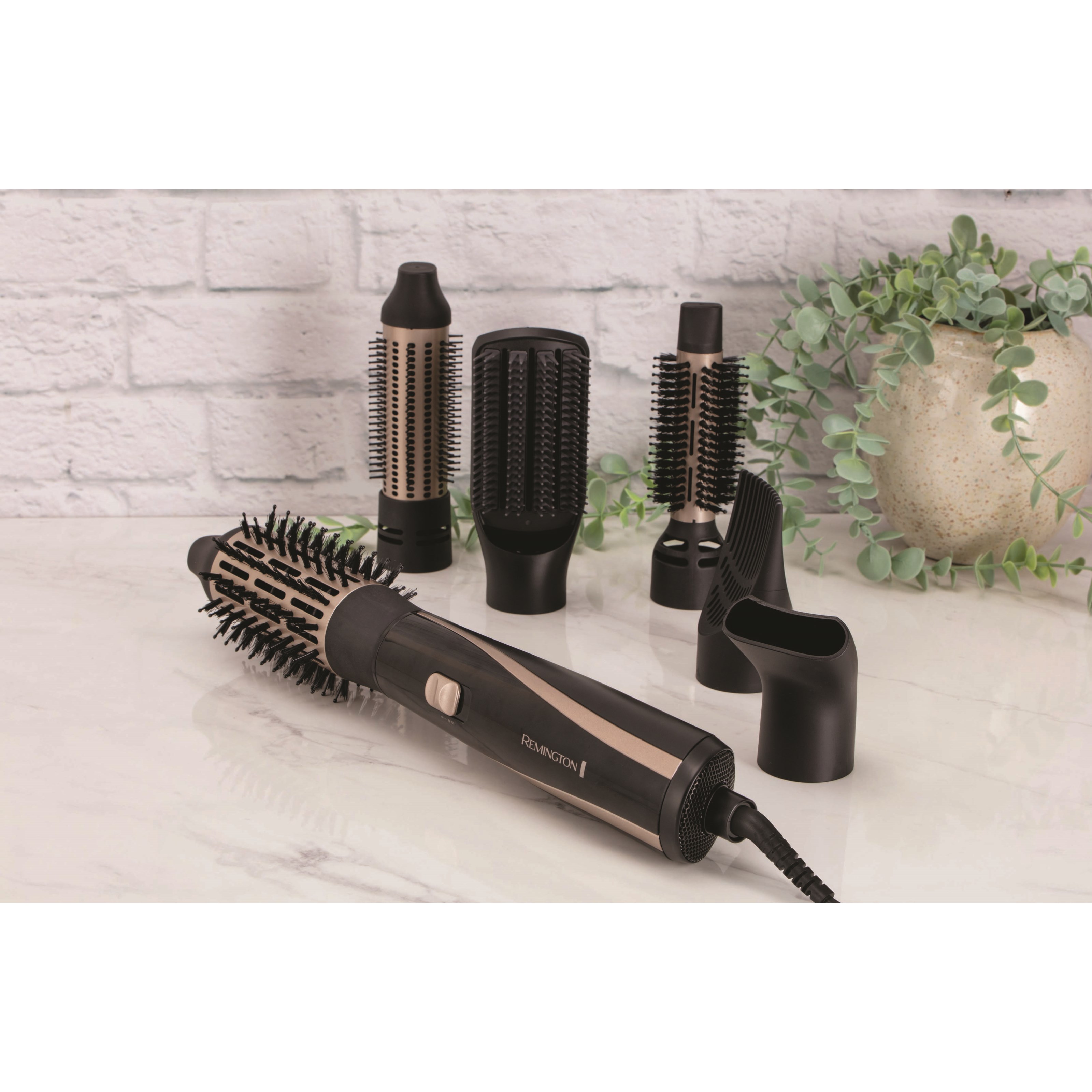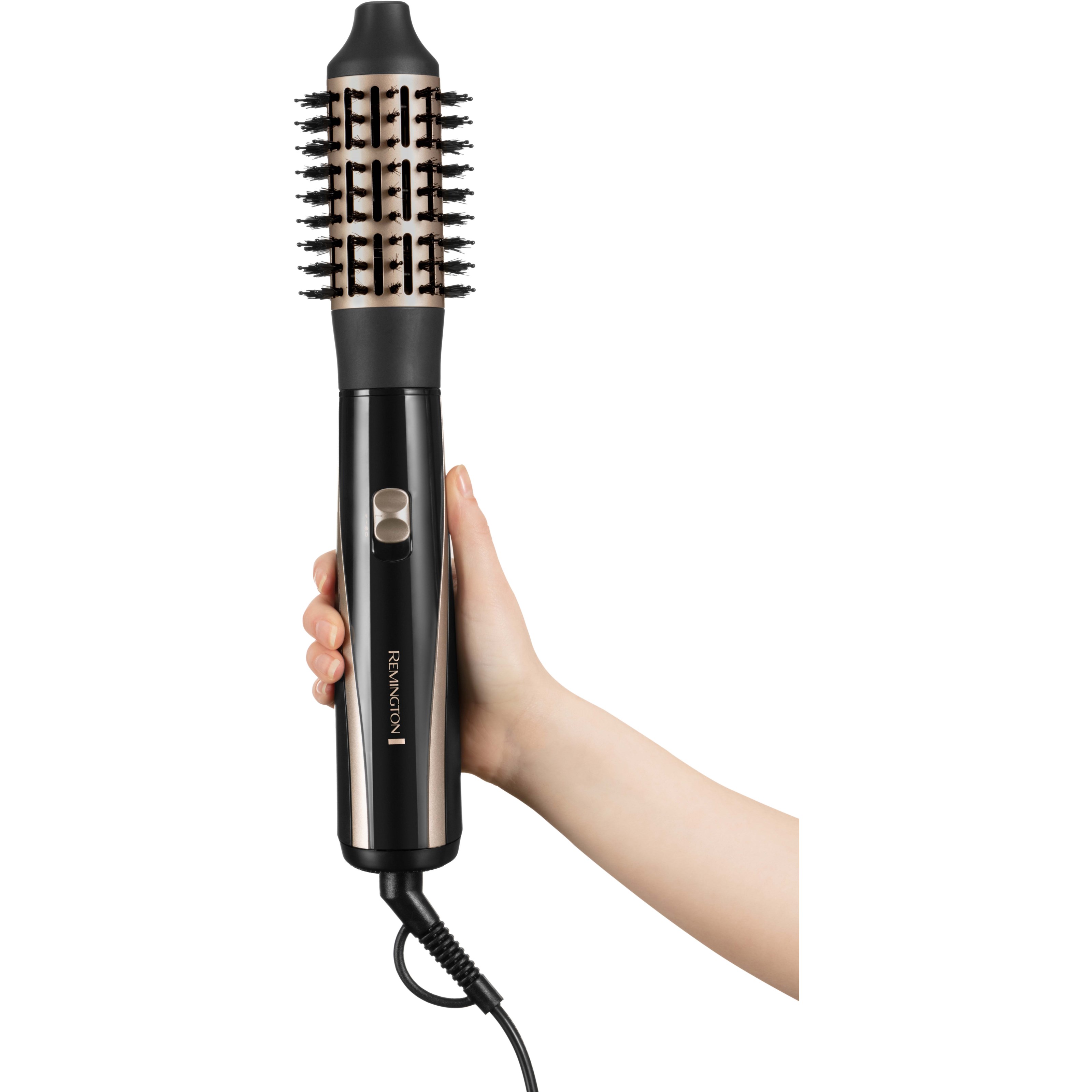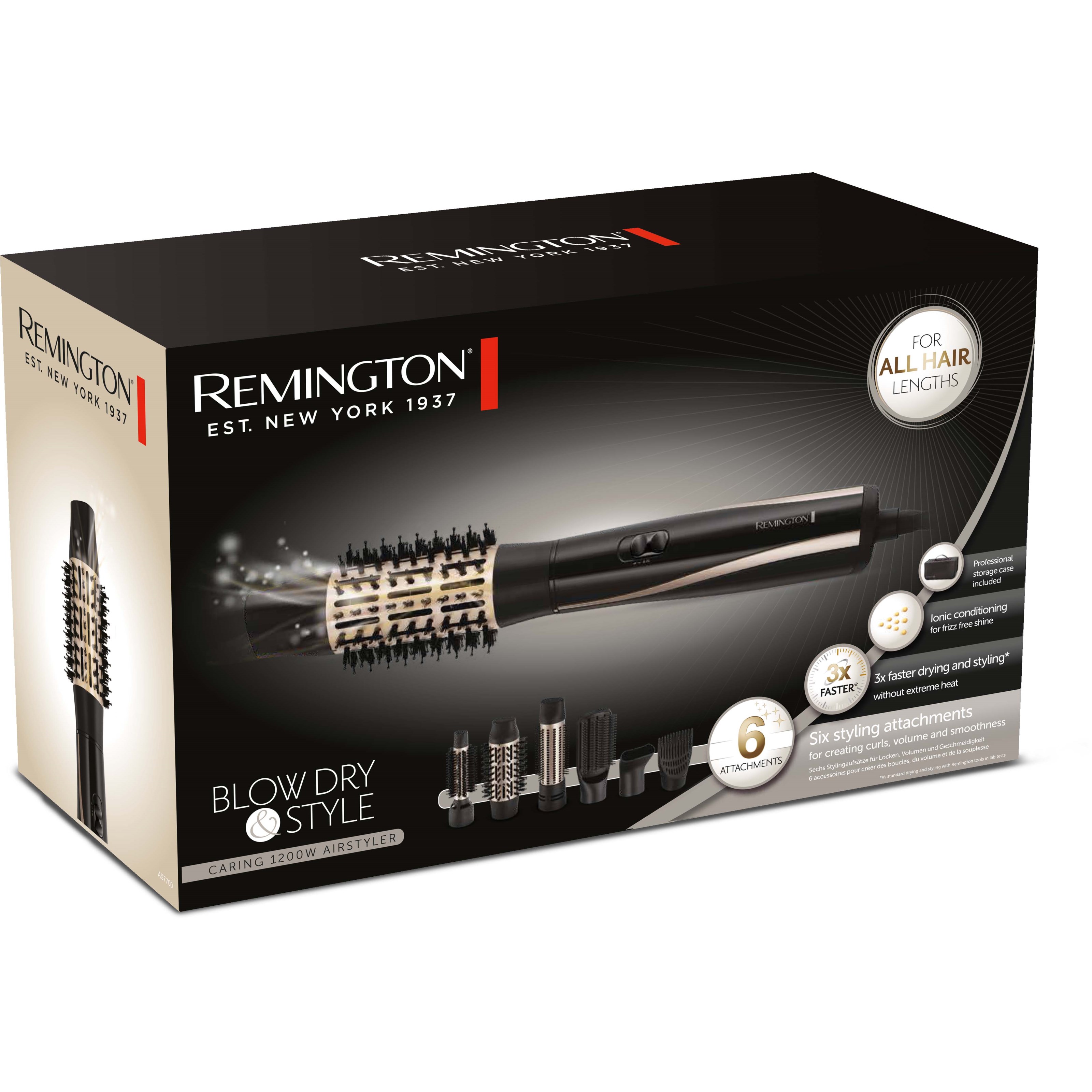 Suszarko-lokówka o mocy 1200 W, idealna dla osób o różnych długościach włosów. Wybierz spośród 2 ustawień ciepła/prędkości oraz funkcji zimnego powietrza, aby utrwalić fryzurę.W zestawie znajdziesz 6 wymiennych akcesoriów, które zostały specjalnie zaprojektowane do stylizacji i modelowania włosów każdej długości:- Szczotka płaska jest idealna, jeśli preferujesz prostsze fryzury i pomaga uzyskać gładki efekt z mniejszą ilością puszenia.- Szczotka obrotowa dodaje objętości u nasady, jednocześnie susząc włosy.- Ceramiczna szczotka o średnicy 38 mm z chowanymi włoskami – do tworzenia objętości i pełni lub do uzyskania średnich i większych luźnych loków i fal.- Ceramiczna szczotka o średnicy 25 mm z mieszanymi włoskami – do tworzenia małych lub średnich loków.- Ceramiczna szczotka o średnicy 50 mm z mieszanymi włoskami – do uzyskania objętości i pełni lub do tworzenia średnich i większych luźnych loków i fal.- Koncentrator – końcówka do suszenia włosów.Aby uzyskać najlepsze rezultaty, używaj suszarko-lokówki na osuszonych ręcznikiem włosach.Wyjmowana siatka została zaprojektowana, aby utrzymać Twoją suszarko-lokówkę w czystości, wolną od kurzu i włosów, co ułatwia czyszczenie.(Długość 43,5 cm Wysokość; 8 cm Głębokość; 8 cm)Funkcje- 1200 W- Ceramiczna szczotka o średnicy 25 mm z mieszanymi włoskami- Ceramiczna szczotka o średnicy 50 mm z mieszanymi włoskami- Ceramiczna szczotka o średnicy 38 mm z chowanymi włoskami- Koncentrator- Szczotka płaska- Szczotka obrotowa- 2 tryby prędkości- Zimne powietrze- Odłączana siatka dla łatwego czyszczenia- Torba do przechowywania- 3 m obrotowy kabel- Gwarancja 3+1 lat*- *Zarejestruj się online w ciągu 28 dni, aby uzyskać dodatkowy rok gwarancji na https://remington-europe.com/