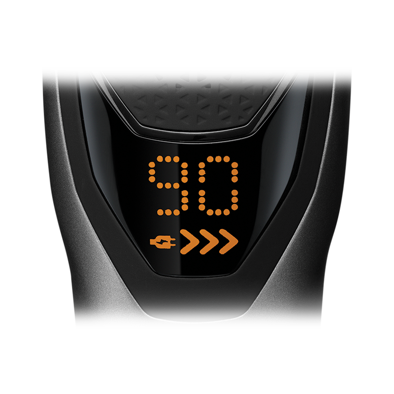 Ergonomicznie zaprojektowany trymer ma powierzchnię, która zapewnia pewny chwyt, co pozwala na pełną kontrolę i komfort podczas przycinania. Jego niezawodny czas pracy bezprzewodowej wynosi 90 minut, a cyfrowy wyświetlacz dokładnie pokazuje, ile minut pozostało do wyczerpania baterii.