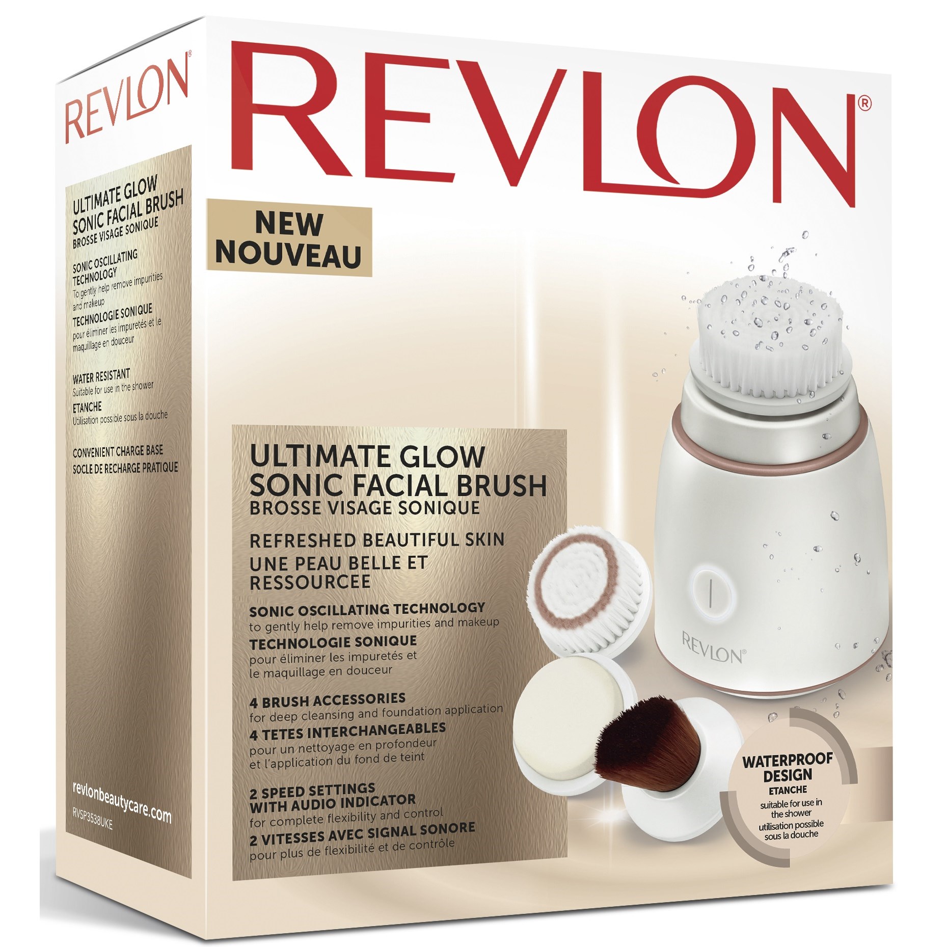 Revlon Ultimate Glow Clean and Make up Sonic Facial Brush masuje i delikatnie oczyszcza skórę, usuwając zanieczyszczenia z porów.