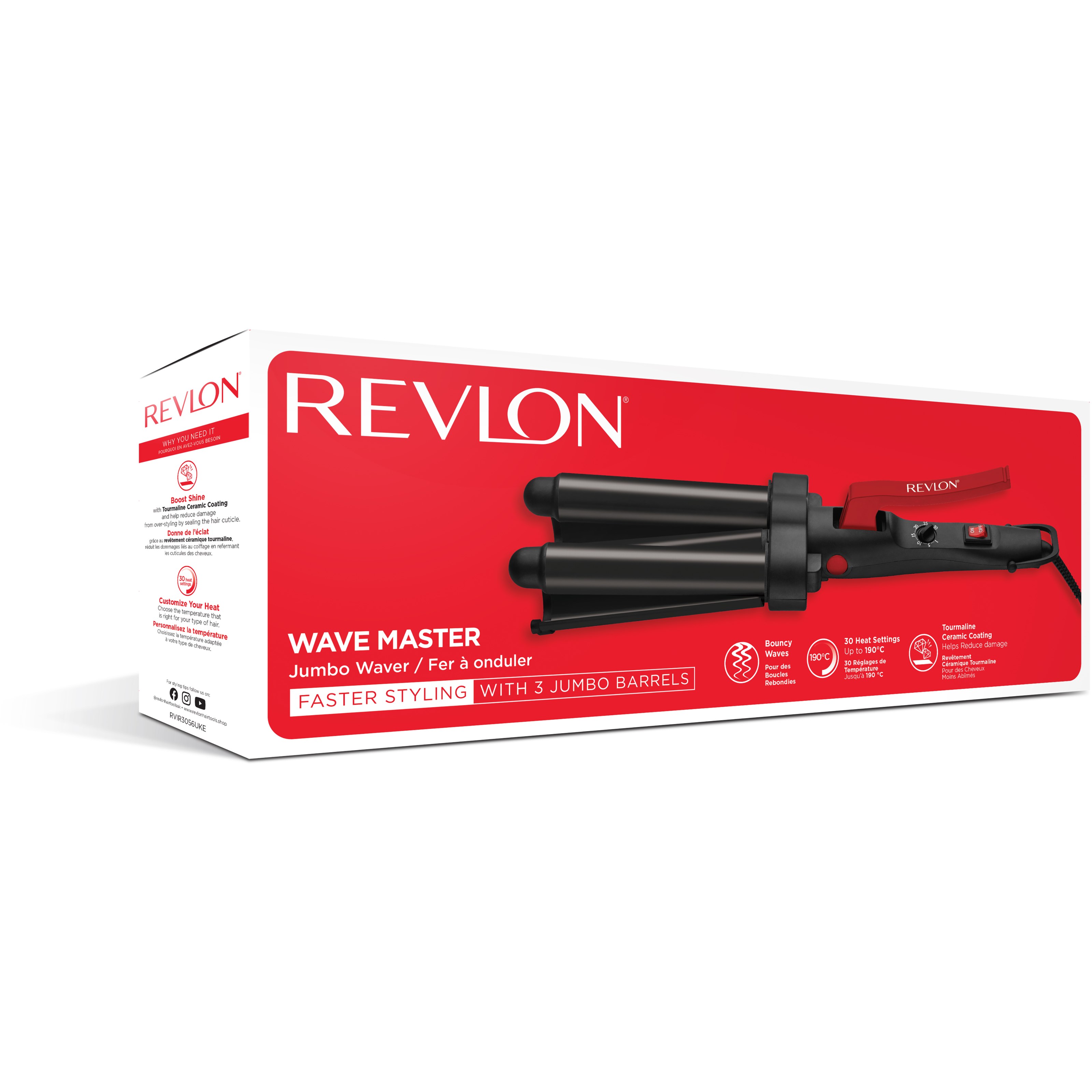 Revlon Wave Master Jumbo Tong RVIR3056UKE tworzy naturalne fale, które trzymają się na włosach przez długi czas. Posiada 30 ustawień temperatury i powłokę turmalinowo-ceramiczną, która chroni włosy przed uszkodzeniami.