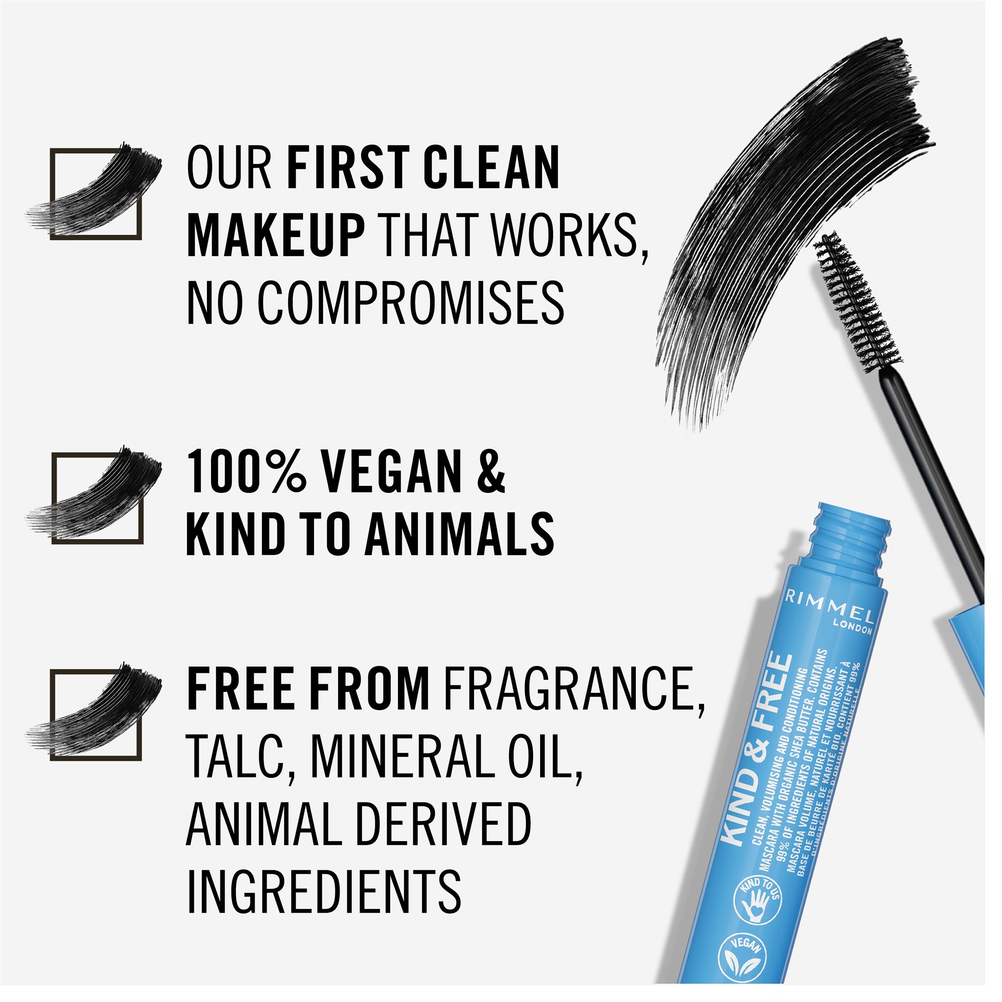 RIMMEL KIND & FREE™ Clean, Volumizing & Lengthening Mascara to wegański, nie testowany na zwierzętach, kondycjonujący tusz, który nadaje piękną objętość i długość rzęsom nawet do 36 godzin. Nie zawiera substancji zapachowych*, olejów mineralnych i składników pochodzenia zwierzęcego*. Formuła ma w składzie certyfikowane, organiczne masło Shea (5%) i biotynę.