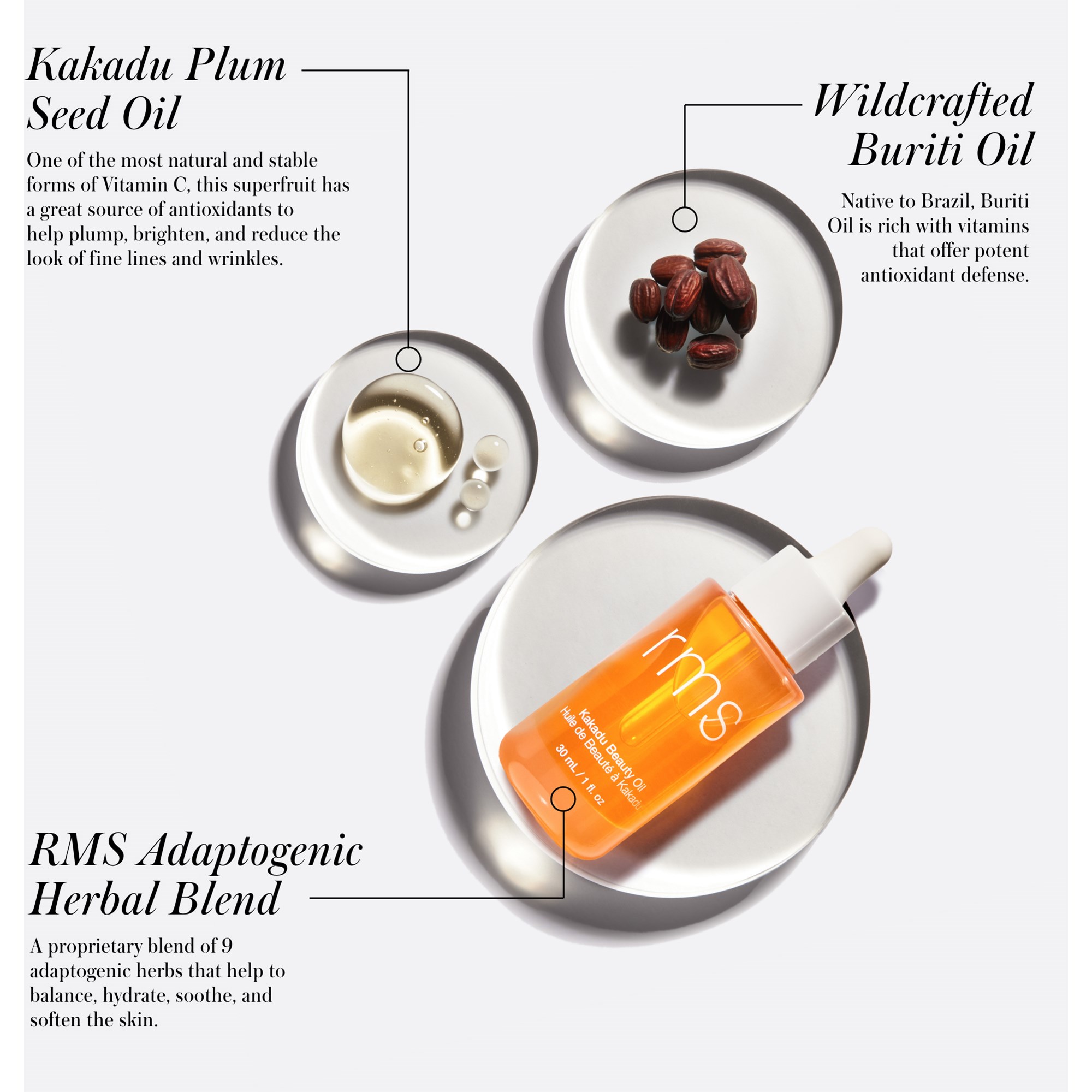 RMS Beauty Kakadu Beauty Oil 10 ml to lekki olejek do twarzy z odżywczymi olejkami, które balansują, chronią i dodają skórze blasku, poprawiając jej strukturę. Szybko się wchłania i jest odpowiedni dla wszystkich rodzajów skóry. Świetnie sprawdza się pod makijaż. Olej z nasion kakadu to najbogatsze i najbardziej stabilne źródło witaminy C, pełne antyoksydantów, które rozjaśniają skórę, dodają jej sprężystości i redukują widoczność drobnych linii i zmarszczek. Olej jojoba balansuje i zmiękcza skórę, a dziko zbierany olej buriti, niezwykle bogaty w beta-karoten, chroni przed wolnymi rodnikami. Adaptogenna mieszanka 9 ziół, w tym lukrecji, kurkumy i nagietka, zmniejsza zaczerwienienia i koi skórę.
