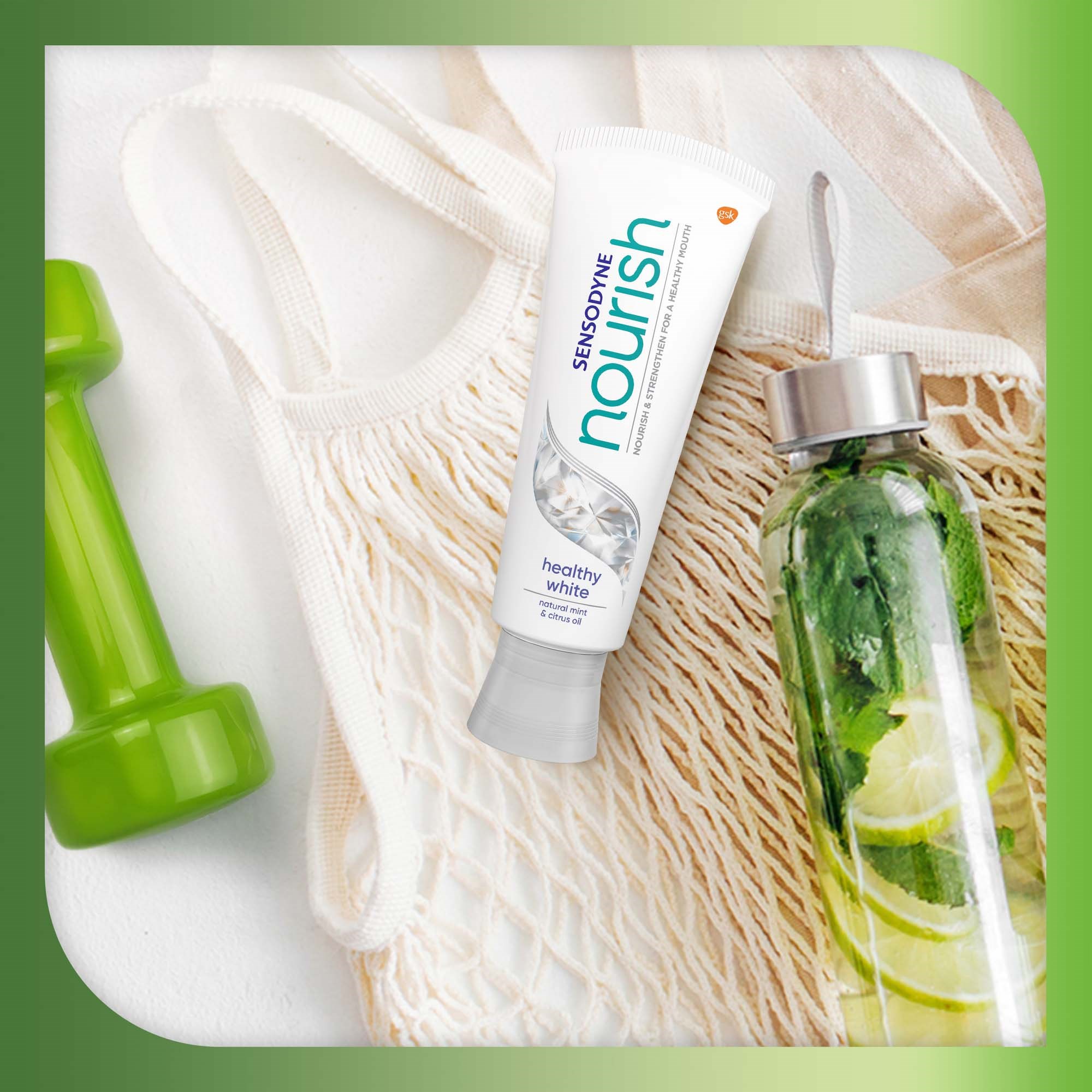 Sensodyne Nourish Healthy White to wegańska pasta do zębów. Zawiera bioaktywne minerały, które wzmacniają i odżywiają zęby, a także chronią przed nadwrażliwością.* Odżywcza pasta pomaga przywrócić naturalną, zdrową równowagę w jamie ustnej.*Pasta do zębów Sensodyne Nourish Healthy White zapewnia klinicznie potwierdzoną ochronę przed nadwrażliwością zębów* oraz usuwa przebarwienia. Zawiera mieszankę naturalnej mięty i olejku cytrusowego, co daje odżywczy i oczyszczający efekt w ustach.Pasta do zębów Sensodyne Nourish Healthy White:Wzmacnia i odżywia zęby dzięki bioaktywnym minerałomUsuwa przebarwieniaChroni przed nadwrażliwością zębów*Zawiera naturalną miętę i olejek cytrusowyJest wegańska*Przy szczotkowaniu zębów dwa razy dziennie.