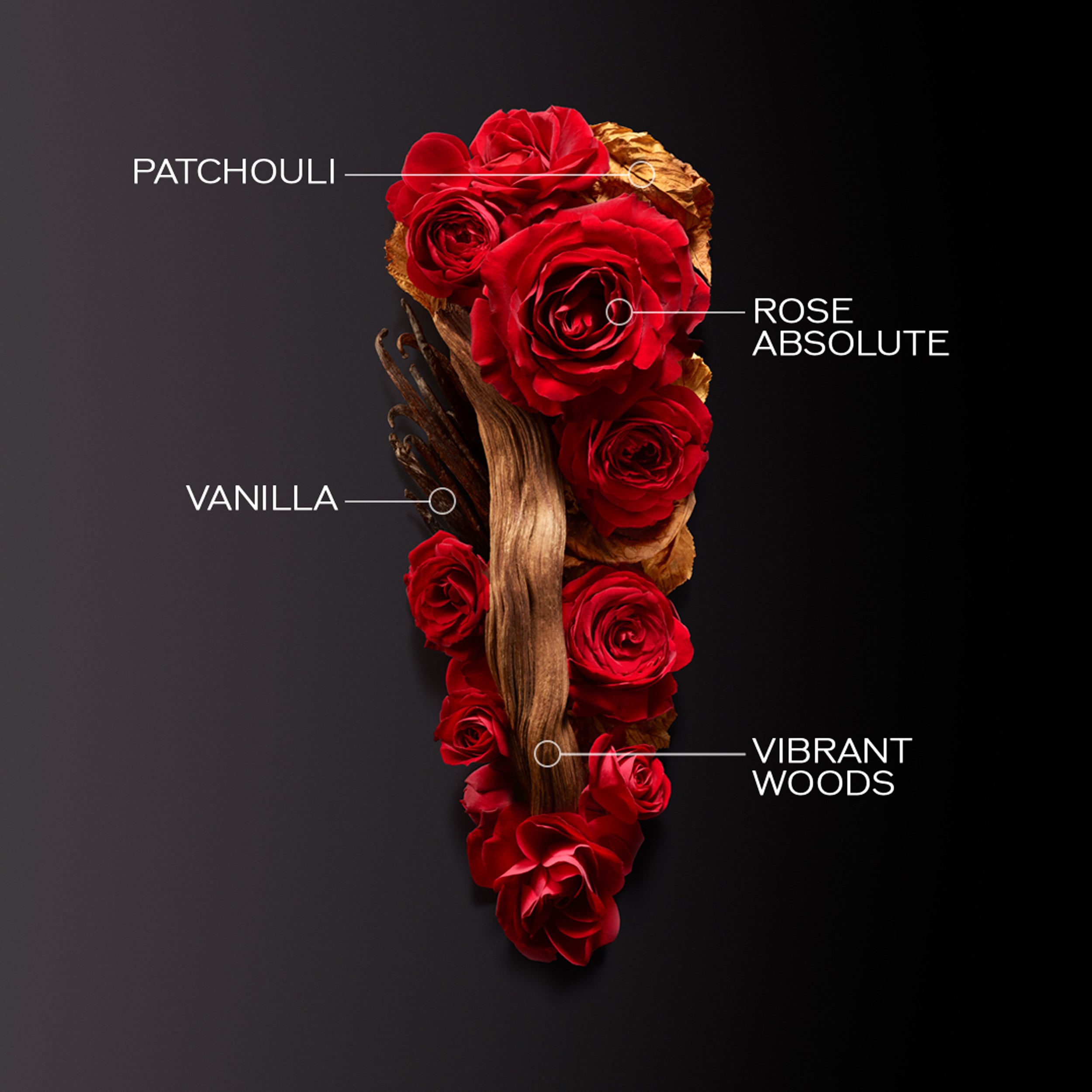 Zapach otwiera się owocowymi nutami liści czarnej porzeczki, zanim ujawni zmysłowe i upajające kwiatowe serce, które oddaje hołd Rose Absolute, uwodzicielskiej i kultowej róży. Nieodparte ciepło bazy wanilii łączy się z intensywnością paczuli. Z zmysłowym czerwonym bukietem kwiatów i żywymi nutami drzewnymi jako punktem centralnym, zapach tworzy idealną równowagę między siłą a zmysłowością. Constance Guisset przeprojektowała kultowy flakon Ginzy.