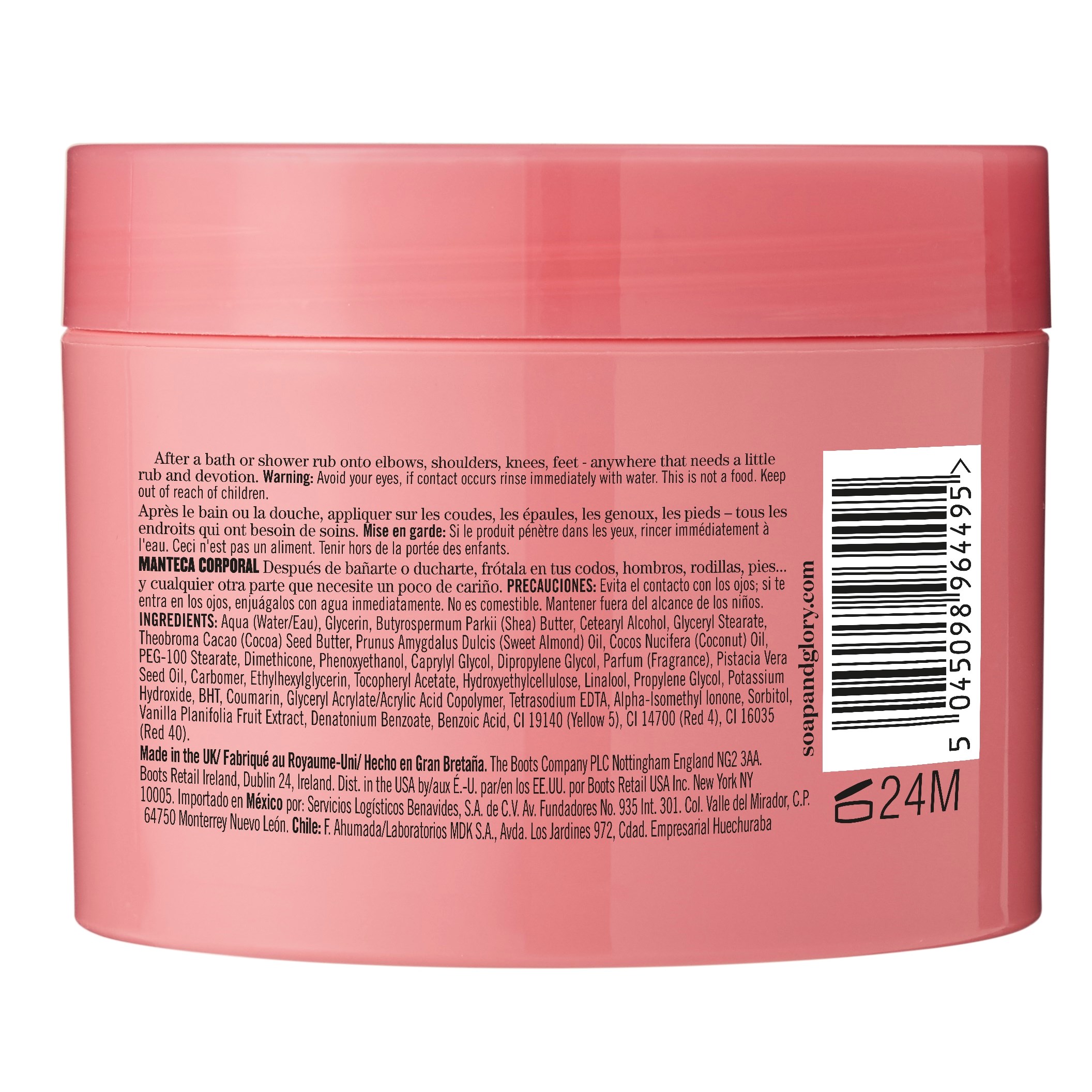 Soap & Glory Smoothie Star Body Butter to wspaniale puszyste masło do ciała, które jest pełne nawilżających składników. Ma kremową i lekką konsystencję, wzbogaconą o słodki, delikatny zapach Smoothie Star, który łączy w sobie nuty pistacji, migdałów i aksamitnej wanilii. Zawiera oleje z pistacji, migdałów i kokosa, a także masło kokosowe i shea. Idealne do stosowania po kąpieli lub prysznicu, pozostawia skórę miękką i jedwabiście gładką. Sposób użycia:Najlepiej sprawdza się po prysznicu lub kąpieli. Wmasuj w całe ciało, świetnie nadaje się także do pielęgnacji stóp.