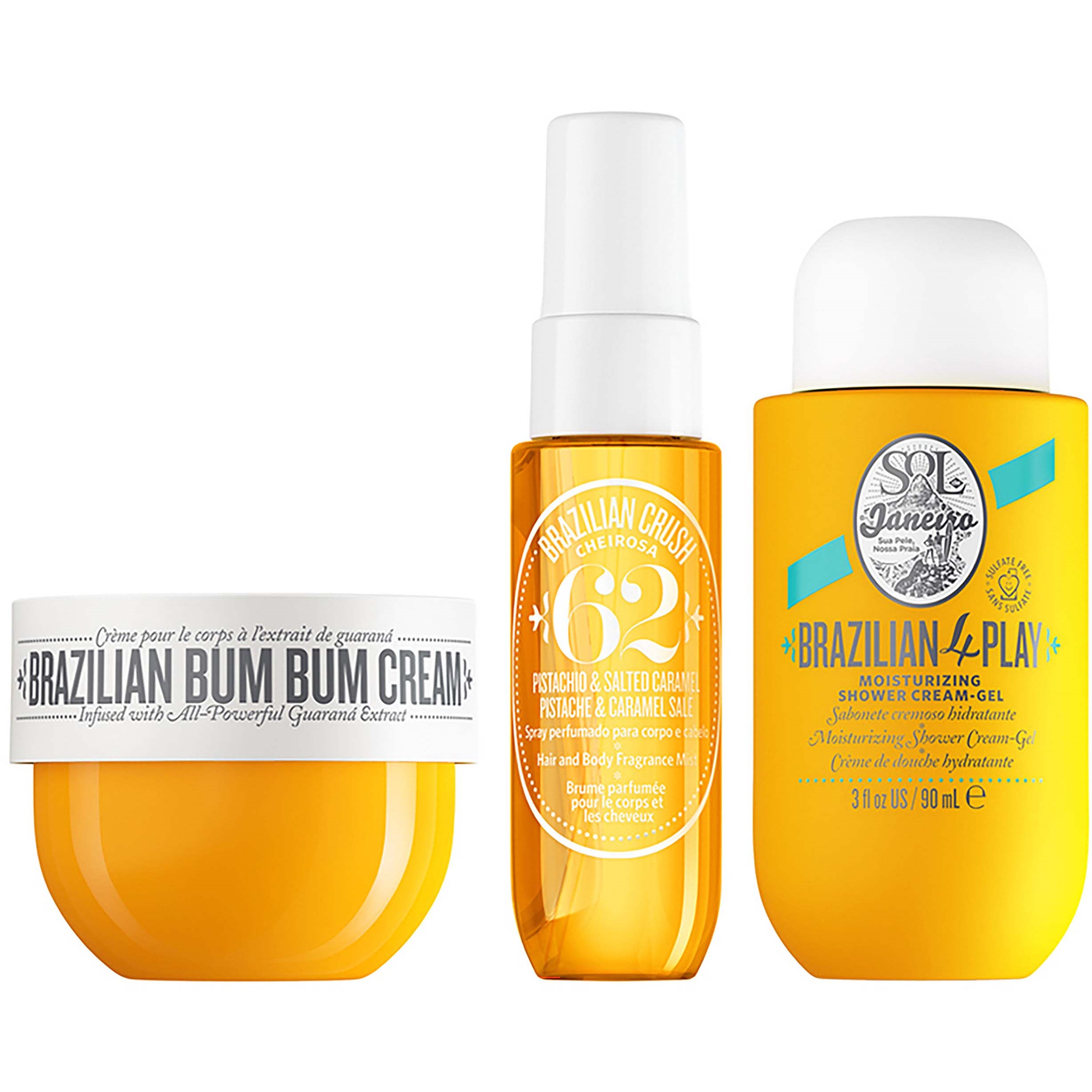Nasz kultowy brazylijski krem Bum Bum zapewnia niesamowitą gładkość skóry z odrobiną blasku, nasz brazylijski krem-żel pod prysznic 4 Play zapewnia czystą, niezwykle miękką skórę, a nasza brazylijska mgiełka zapachowa do włosów i ciała Brazilian Crush Cheirosa '62 uzależnia od swojego zapachu od stóp do głów.