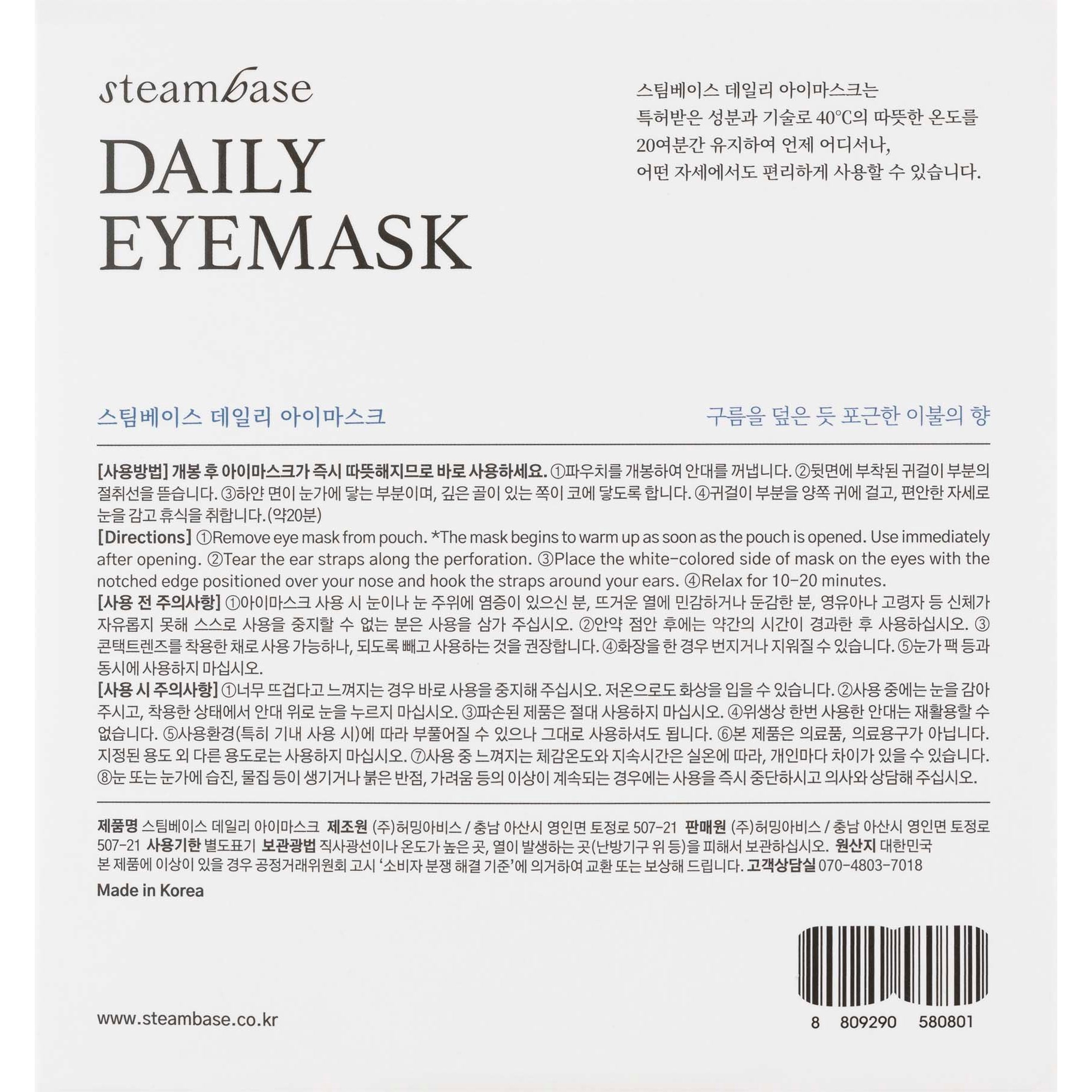 STEAMBASE Daily Eyemask to samonagrzewająca się maseczka na oczy z kojącą parą termalną. Relaksujące ciepło do 40°C przez 20 min pomaga zredukować stres, jakbyś była otoczona liśćmi rumianku i spokojem natury.1. Zawiera prawdziwą wodę termalną Onyang, która redukuje zmęczenie oczu ciepłą parą.2. W 100% wyprodukowana w Korei i wyróżniona certyfikatem „Brand K” przyznawanym przez rząd Korei dla wybranych i autoryzowanych marek.3. Wykonana z użyciem ciepła i fal ultradźwiękowych, bez szkodliwych klejów w procesie produkcji.4. Dzięki temu, że element grzewczy nie jest w formie proszku, nie ma ryzyka wycieku lub rozlania z opakowania.