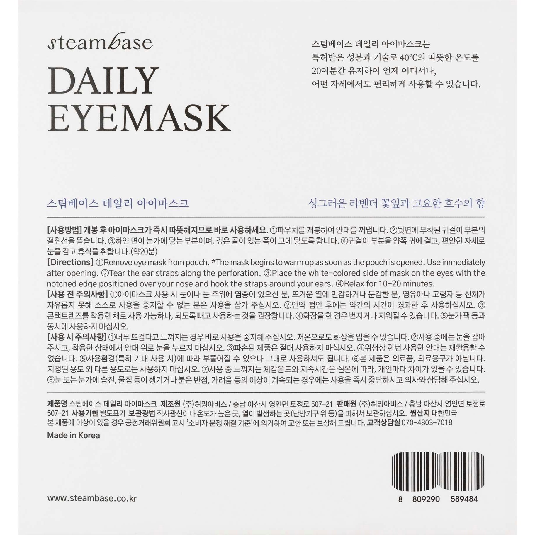 STEAMBASE Daily Eyemask to samonagrzewająca się maseczka na oczy z kojącą parą termalną. Relaksujące ciepło do 40°C przez 20 min pomaga zredukować stres, jakbyś była otoczona liśćmi rumianku i spokojem natury.1. Zawiera prawdziwą wodę termalną Onyang, która redukuje zmęczenie oczu ciepłą parą.2. W 100% wyprodukowana w Korei i wyróżniona certyfikatem „Brand K” przyznawanym przez rząd Korei dla wybranych i autoryzowanych marek.3. Wykonana z użyciem ciepła i fal ultradźwiękowych, bez szkodliwych klejów w procesie produkcji.4. Dzięki temu, że element grzewczy nie jest w formie proszku, nie ma ryzyka wycieku lub rozlania z opakowania.