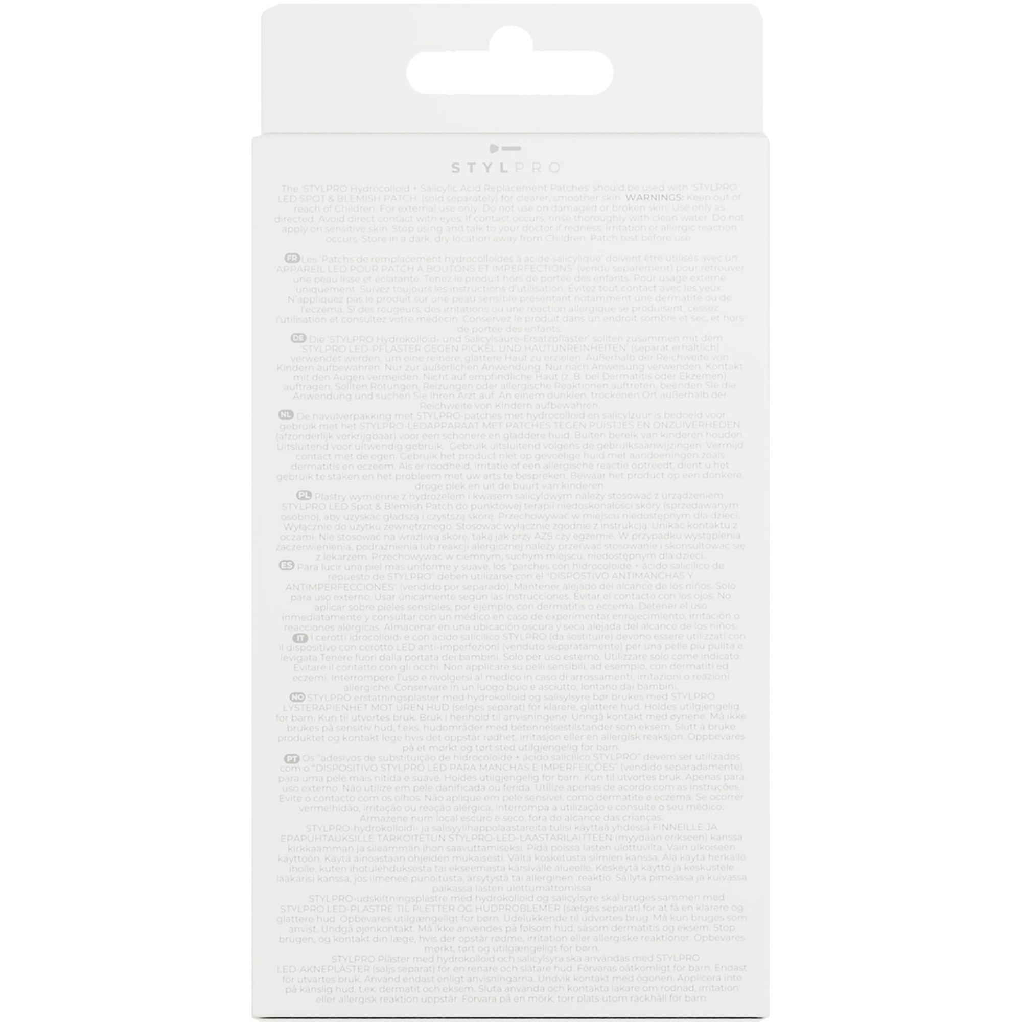 Plastry wymienne z hydrożelem i kwasem salicylowym należy stosować z urządzeniem STYLPRO LED Spot & Blemish Patch do punktowej terapii niedoskonałości skóry (sprzedawanym osobno), aby uzyskać gładszą i czystszą skórę.Sposób użycia:1. Oczyść i osusz twarz 2. Oderwij plaster z arkusza. Przyklej do urządzenia STYLPRO LED. 3. Oderwij plastikowy języczek ochronny. 4. Włącz urządzenie STYLPRO LED i przyłóż do twarzy. 5. Odczekaj 10 minut. Odklej urządzenie LED, pozostawiając plaster na skórze. Pozostaw na noc lub na minimum 5 godzin