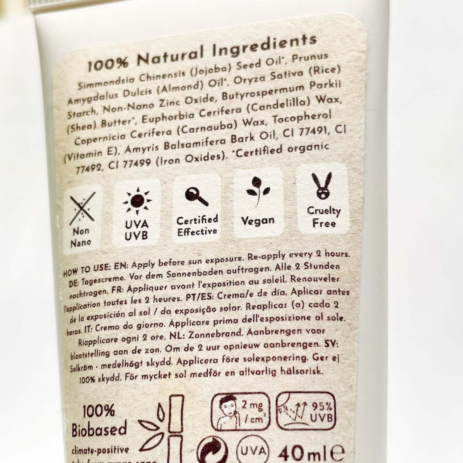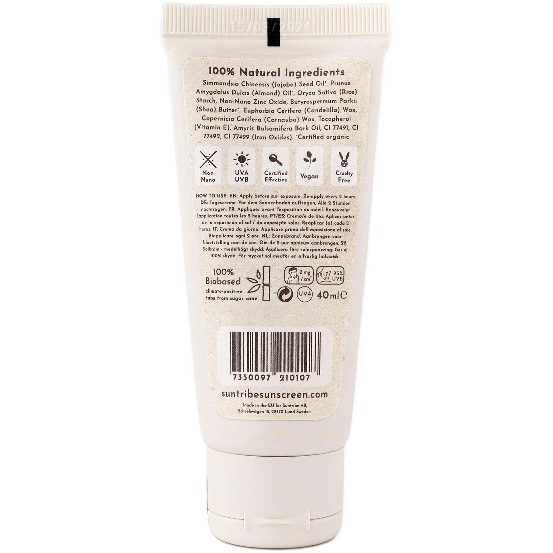 Nawilżający krem na dzień na bazie cynku, idealny do codziennego stosowania przed lub zamiast makijażu. Chroni skórę przed słońcem dzięki mineralnemu filtrowi UV, jakim jest tlenek cynku. Oferuje szerokie spektrum ochrony przed promieniowaniem UVA i UVB. Lekka formuła z naturalnym odcieniem, która matuje i szybko się wchłania. Formuła została opracowana tak, aby nie pozostawiać białego filmu po aplikacji. Ekologiczne oleje z migdałów i jojoby odżywiają oraz nawilżają skórę, nie pozostawiając jej błyszczącej. W 100% wolna od parabenów, alergenów i sztucznych dodatków. To naturalna i bezpieczna alternatywa, aby chronić skórę przed uszkodzeniami spowodowanymi słońcem. Opracowana we współpracy z naukowcami z Uniwersytetu w Lund w Szwecji. Optymalna dla skóry wrażliwej, normalnej i suchej. Niekomedogenna (nie zatyka porów) i wypełniona naturalnymi antyoksydantami, które chronią skórę przed działaniem zewnętrznym. Krem na dzień Suntribes SPF 20 działa jak tarcza na skórze, zapewniając ochronę zaraz po aplikacji. Ten krem przeciwsłoneczny do twarzy jest całkowicie wolny od chemicznych filtrów UV i chroni przed 94% promieniowania UVB (SPF 20). Krem na dzień jest certyfikowany jako wegański. Wegański krem przeciwsłoneczny zawiera dziewięć naturalnych i ekologicznych składników: olej migdałowy, masło shea, olej jojoba, skrobię ryżową, tlenek cynku, wosk karnauba, wosk kandelilla, tlenek żelaza i witaminę E. Najlepiej zużyć przed: 12 miesięcy, data znajduje się na opakowaniu. Przechowywać w suchym i ciemnym miejscu w temperaturze pokojowej lub chłodniejszej (5-20 stopni). Unikać bezpośredniego światła słonecznego. Materiał: Tubka z recyklingowanego aluminium z plastikową nakrętką, 100% etykiety z recyklingowanego papieru. Recykling: Recykluj tubkę w metalu. Recykluj nakrętkę w plastiku. Wyprodukowano w UE.Odpowiedni dla wszystkich typów skóry, w tym wrażliwej. Produkt przeznaczony do codziennego użytku, może być stosowany przed makijażem.To innowacyjny, naturalny krem na dzień. Ekologiczne składniki i fizyczny filtr przeciwsłoneczny. Formuła to lekki, barwiony krem. Stosować na twarz przed ekspozycją na słońce. Tylko łagodne składniki, które dobrze nadają się do wrażliwej skóry. Opakowanie z recyklingowanego aluminium. Certyfikowany SPF 20, szerokie spektrum (UVA/UVB). Wszystkie składniki ekologiczne są certyfikowane pochodzenia. Krem na dzień Suntribes SPF 20 jest przeznaczony do stosowania na twarzy. Nałóż cienką warstwę przed ekspozycją na słońce. Przechowywać w suchym miejscu w temperaturze pokojowej. Nie wystawiać opakowania na bezpośrednie działanie promieni słonecznych. Produkt ma rok trwałości w stanie nieotwartym, sześć miesięcy po otwarciu.