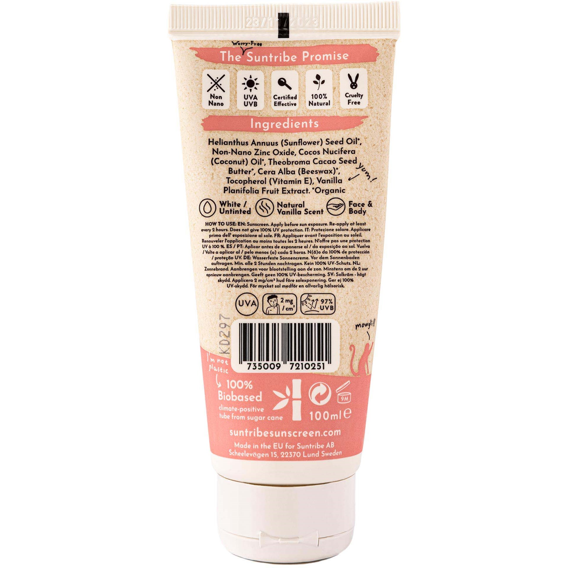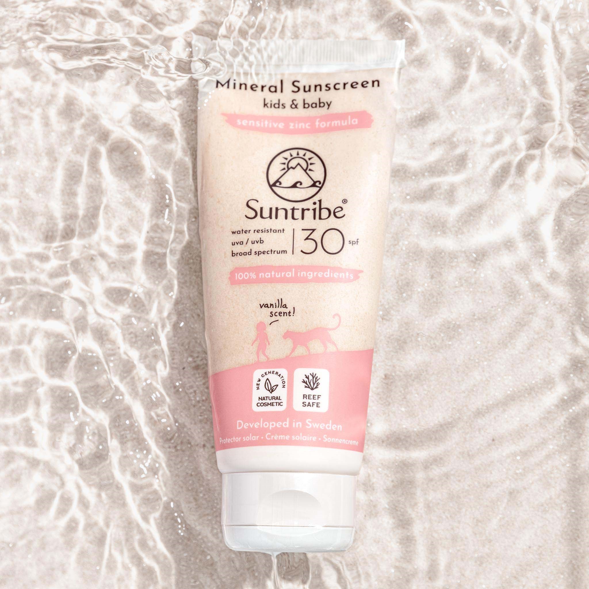 Naturalna mineralna ochrona przeciwsłoneczna dla dzieci. Hipoalergiczna formuła stworzona z myślą o wrażliwej skórze maluchów. Oparta na czystych, naturalnych składnikach, które nie podrażniają delikatnej skóry dzieci ani nie szczypią w oczy, gdy przypadkowo się tam dostaną.Zapewnia szerokie spektrum ochrony SPF 30 przed promieniowaniem UVA i UVB (blokuje 97% promieni UVB). Wodoodporna przez 40 minut. Zawiera tlenek cynku bez nanocząsteczek, który według badań jest najbezpieczniejszym dostępnym filtrem UV dla zdrowia ludzi, koralowców i życia morskiego.Krem przeciwsłoneczny zamknięty jest w innowacyjnej tubie z trzciny cukrowej i ma nieodparty, naturalny zapach wanilii.Suntribe All Natural Kids Vanilla jest stworzony do stosowania na twarzy i ciele Twojego dziecka. Aplikuj przed ekspozycją na słońce. Dla najlepszych efektów zalecamy nałożenie kropek kremu na skórę. Następnie rozprowadź go na cienką i równą warstwę, wykonując okrężne ruchy. Nakładaj ponownie co dwie godziny lub bezpośrednio po kąpieli, aktywności fizycznej lub osuszeniu. Użyj bieli kremu jako wskazówki, czy potrzebujesz nałożyć więcej.