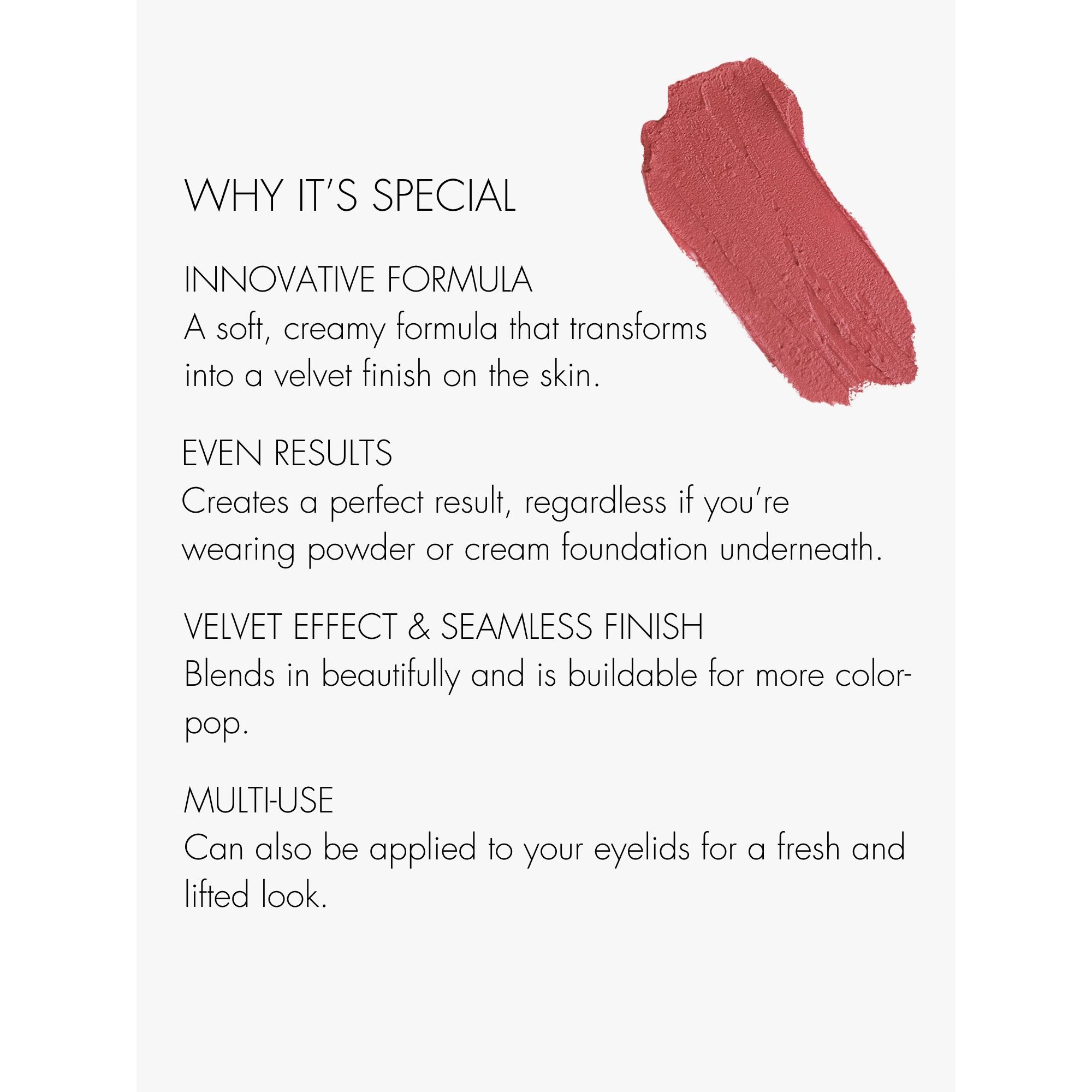 Przyszłość jest teraz! Ten unikalny róż do policzków ma puszystą konsystencję, a to miłość od pierwszego pociągnięcia pędzla. Miękka, kremowa formuła zmienia się w luksusowe, aksamitne wykończenie na skórze. To spełnienie marzeń.