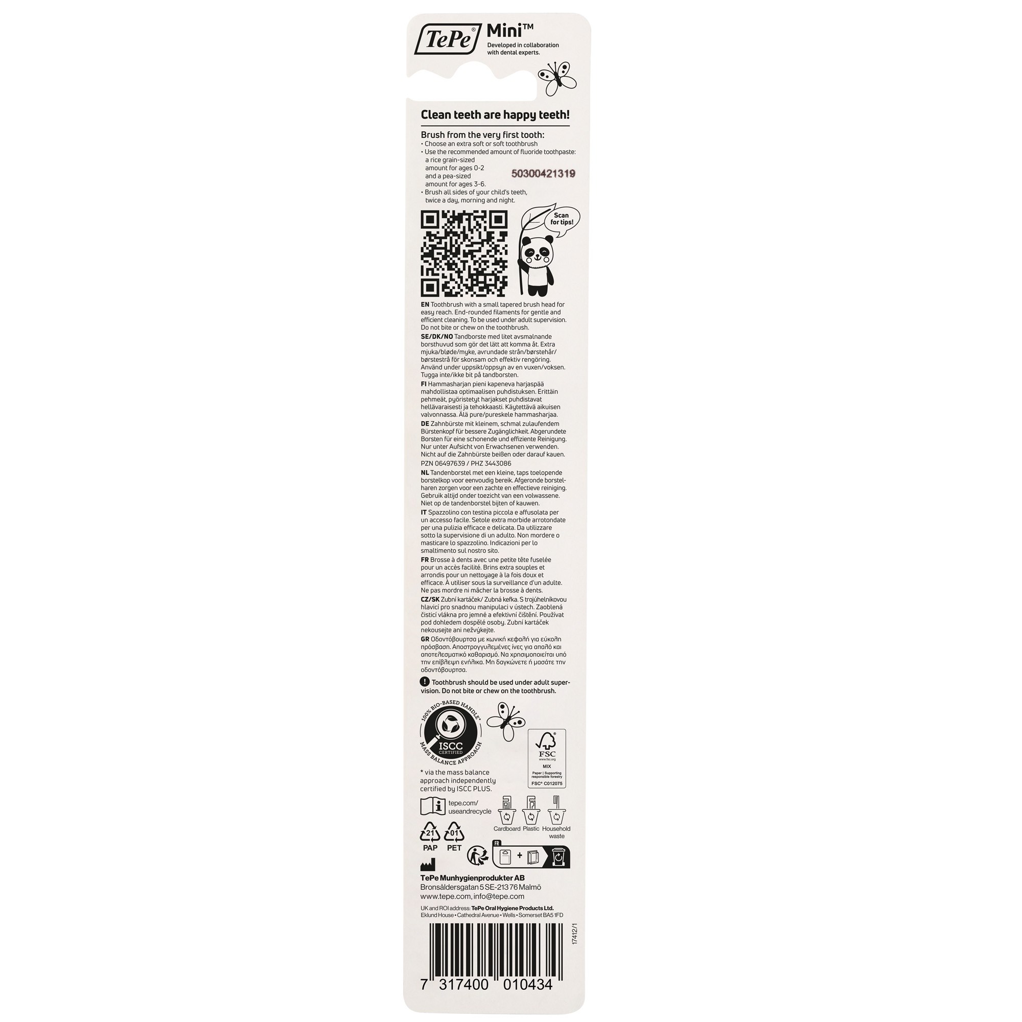 TePe Mini™ jest częścią serii TePe Select. Wyjątkowo miękka szczoteczka TePe Mini™ z mini głowką i małą rączką, przeznaczona do stosowania od pierwszego ząbka do 3 roku życia. Zwężająca się główka szczoteczki posiada wyjątkowo miękkie włókna, które zapewniają delikatne czyszczenie. Rączka zapewnia stabilny uchwyt dla osoby dorosłej szczotkującej zęby dziecka, ale równie dobrze pasuje do małej rączki. Regularne szczotkowanie zapobiega próchnicy i nieświeżemu oddechowi.