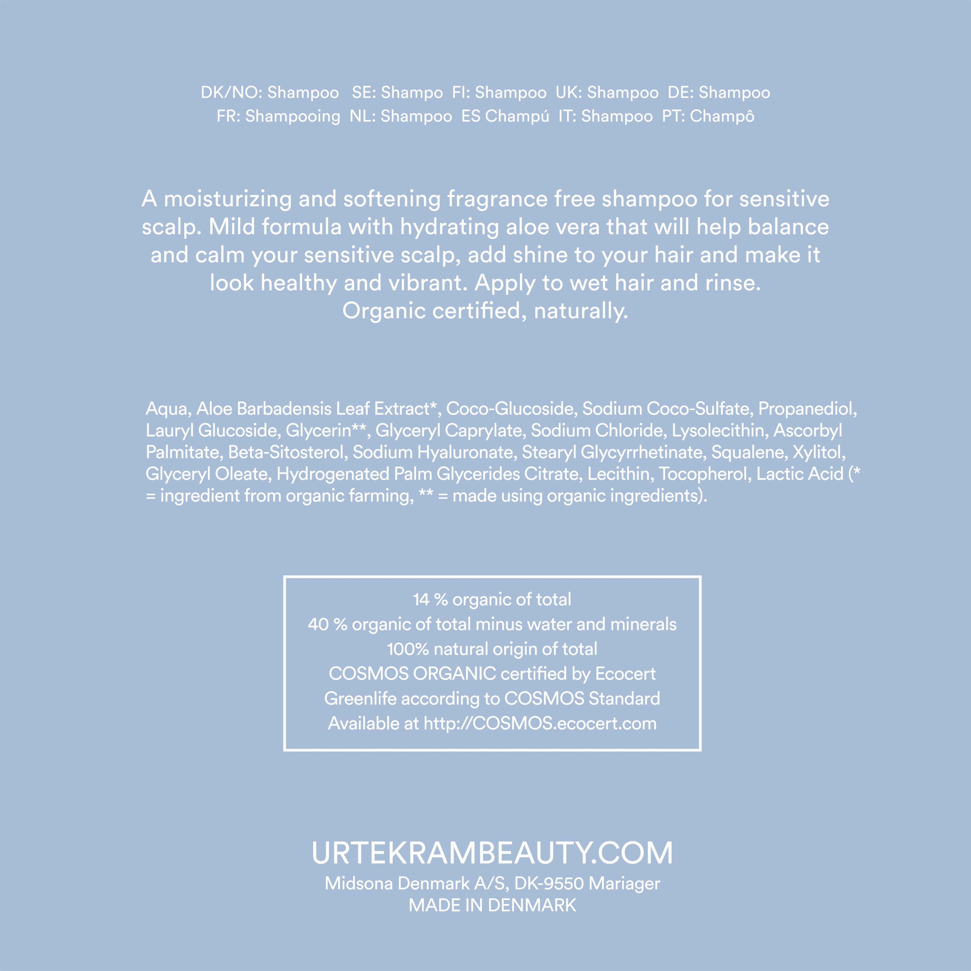 Urtekram Fragrance Free Shampoo to nawilżający, nadający miękkość włosom szampon do wrażliwej skóry głowy. Łagodna formuła z nawilżającym aloesem, która pomoże zrównoważyć i uspokoić wrażliwą skórę głowy, doda włosom blasku i sprawi, że będą wyglądały zdrowo i żywo. Certyfikowany przez Ecocert Cosmos Organic, w 100 % naturalnego pochodzenia i wegański.
