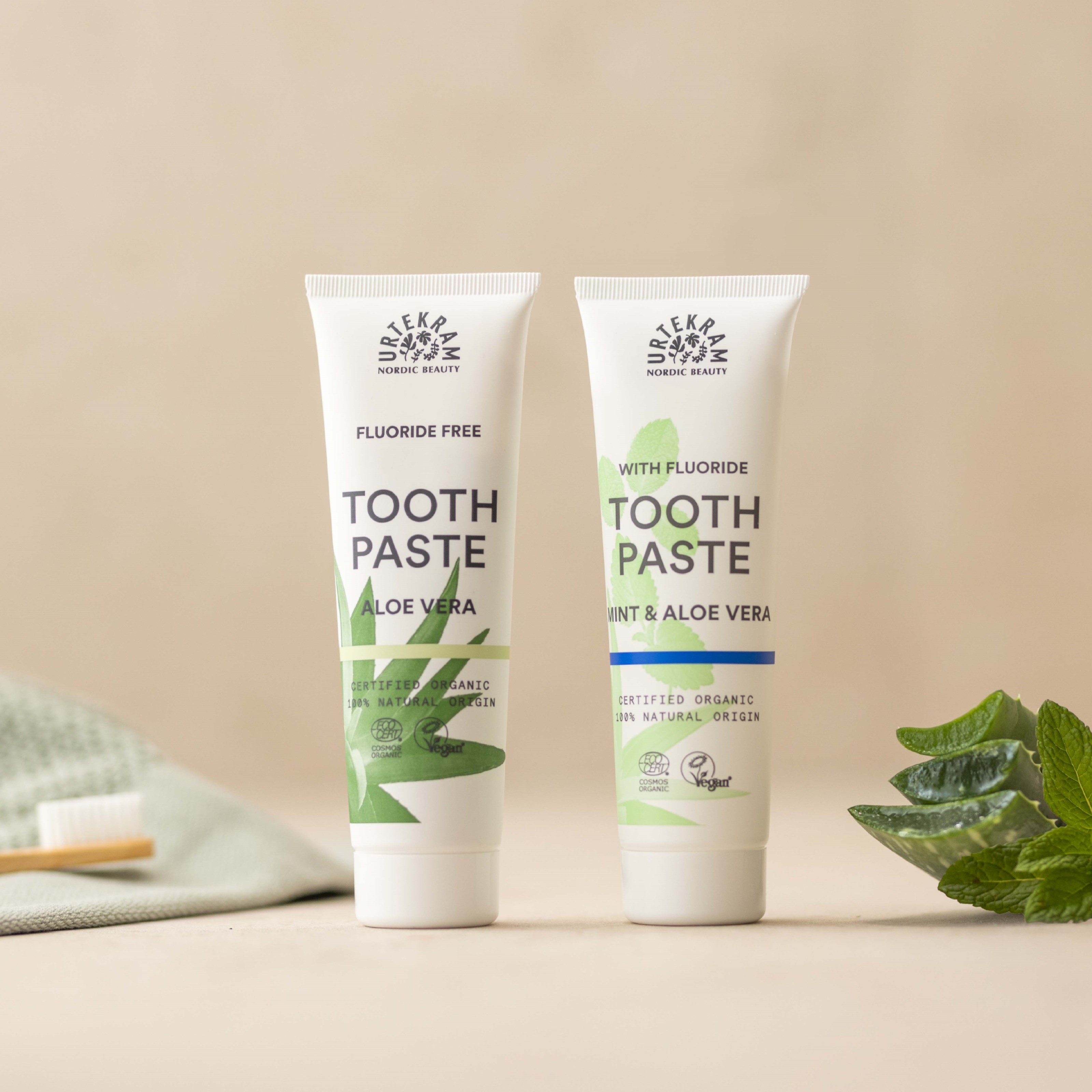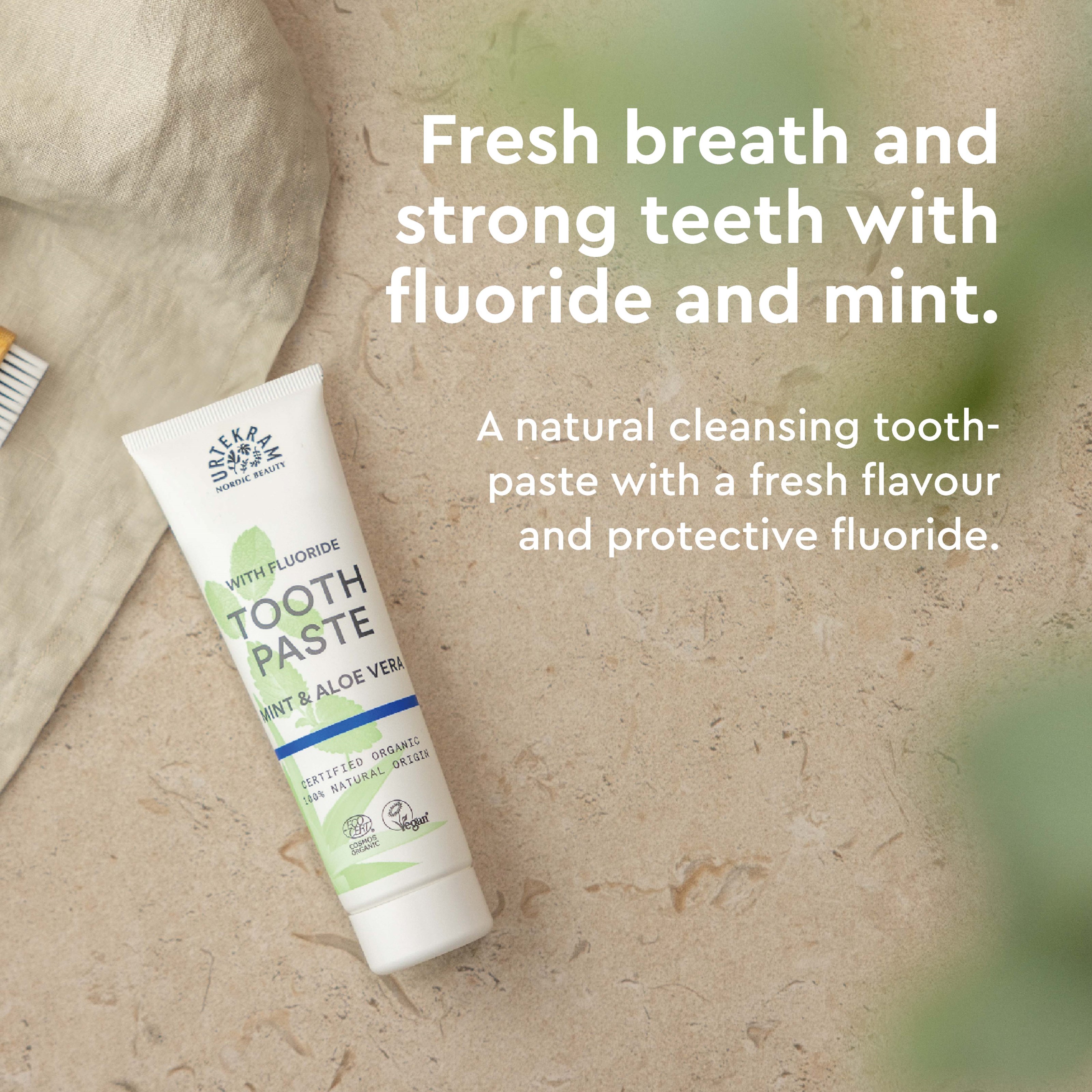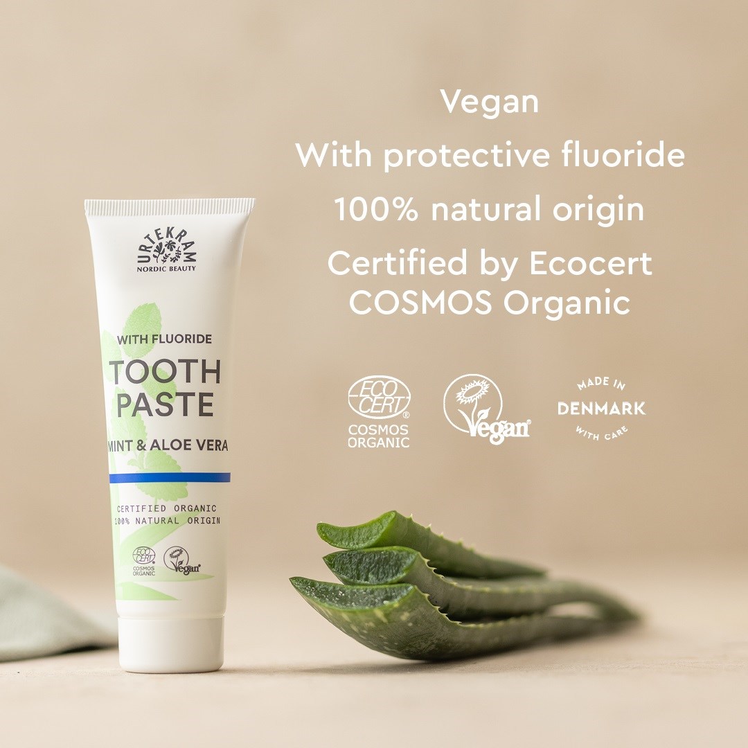 Urtekram Toothpaste Mint to miętowa pasta do zębów z dodatkiem fluoru i aloesu. Nowy standard Cosmos Organic dopuszcza stosowanie fluorku sodu, więc Urtekram oferuję produkt również dla tych, którzy chcą dodatkowo fluorowego zabezpieczenia. Certyfikowana przez Ecocert Cosmos Organic, wegańska i pochodzenia naturalnego.