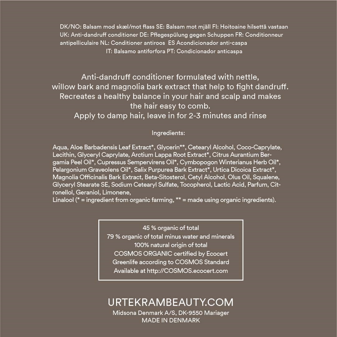 Odżywka Urtekram Nettle sformułowana z ekstraktem z pokrzywy, kory wierzby i magnolii pomaga zwalczyć łupież i przywrócić zdrową równowagę włosów i skóry głowy. Wmasować we włosy i pozostawić na 2-3 minuty. Certyfikowany przez Ecocert Cosmos Organic, wegański i pochodzenia naturalnego.