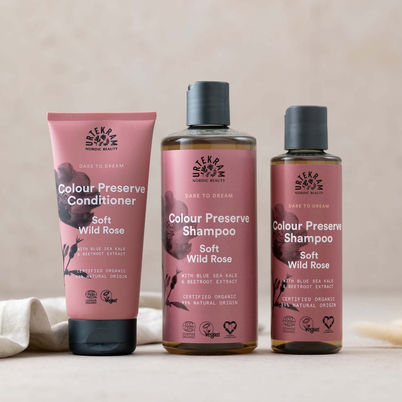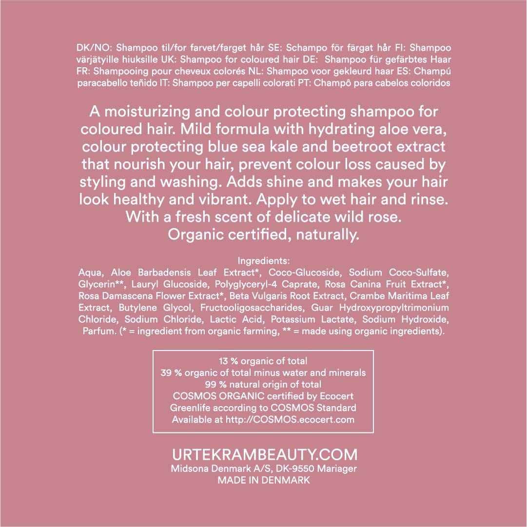 Szampon Urtekram Colour Preserve, nawilżający i chroniący kolor stworzony z myślą o włosach farbowanych. Łagodna formuła z nawilżającym aloesem, chroniącym kolor niebieskim jarmużem morskim i ekstraktem z korzenia buraka, który odżywia włosy, zapobiega utracie koloru spowodowanej stylizacją i myciem, dodaje blasku i sprawia, że włosy wyglądają zdrowo i żywo. Nałóż na mokre włosy i spłucz. O świeżym, delikatnym zapachu dzikiej róży. Certyfikowany przez Ecocert Cosmos Organic, wegański i w 99 % pochodzenia naturalnego.