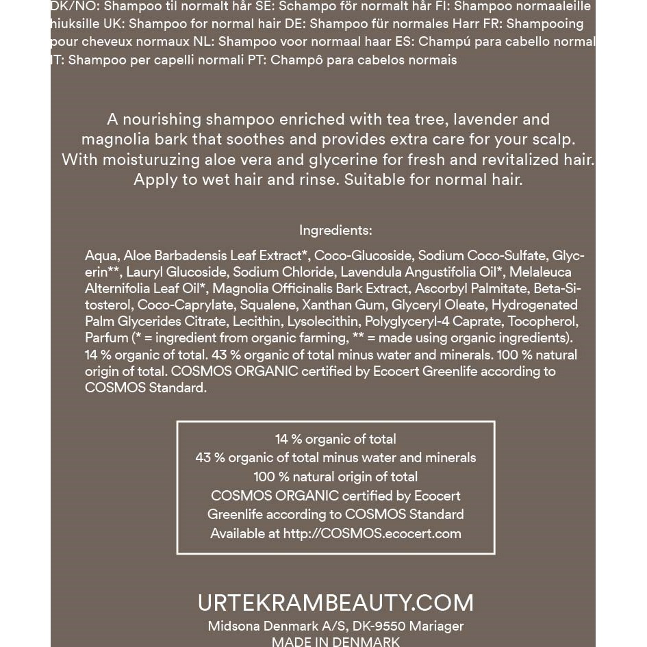 Urtekram Tea Tree jest odpowiedni dla podrażnionej skóry głowy, która potrzebuje dodatkowej kojącej pielęgnacji. Szampon Tea Tree zawiera drzewo herbaciane, lawendę i korę magnolii, które odżywiają włosy i skórę głowy, a gliceryna i aloes dodatkowo je pielęgnują i nawilżają. Certyfikowany przez Ecocert Cosmos Organic, wegański i pochodzenia naturalnego.