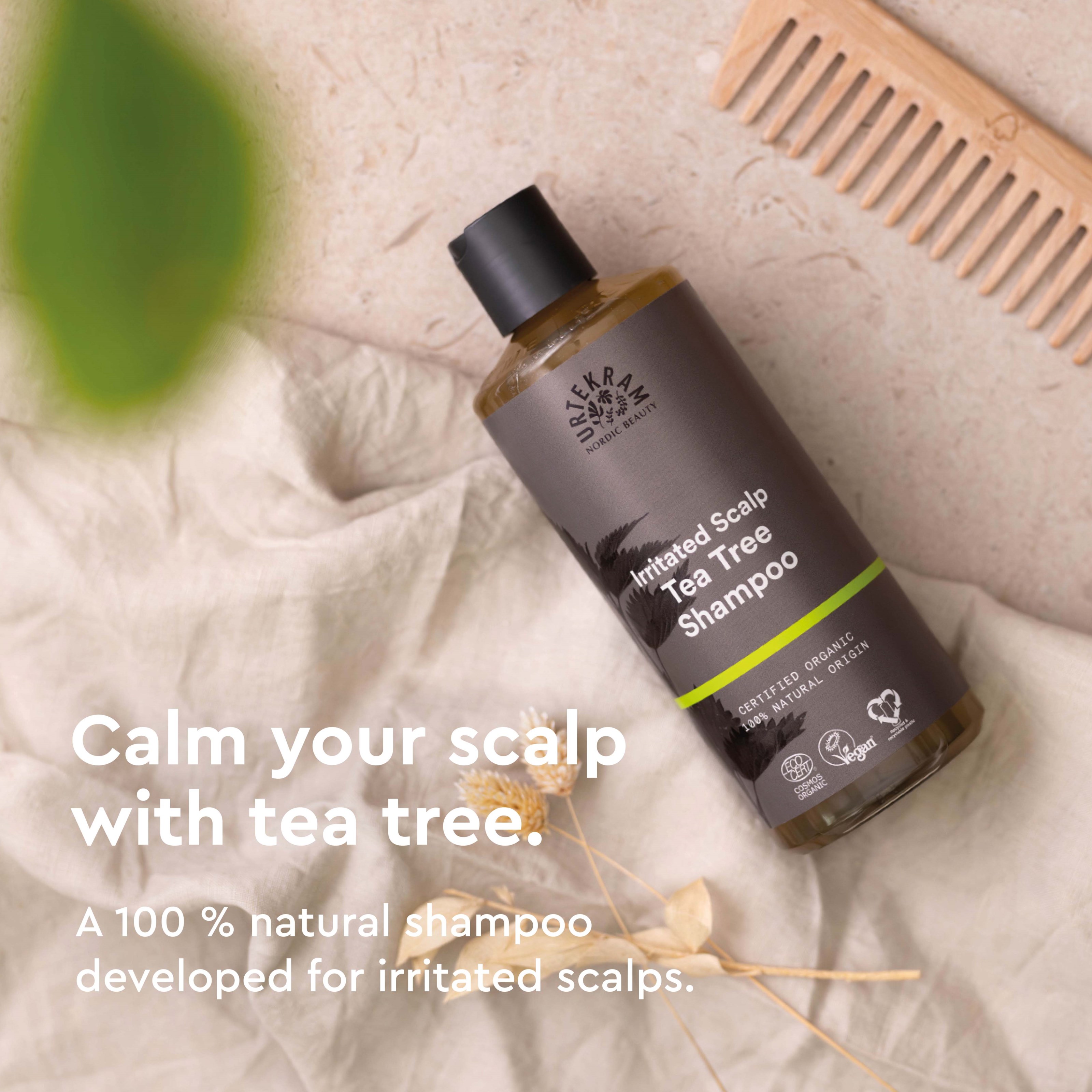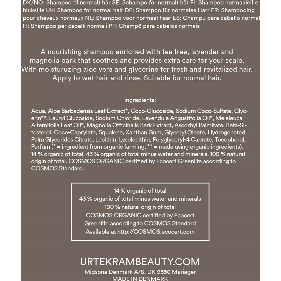 Urtekram Tea Tree jest odpowiedni dla podrażnionej skóry głowy, która potrzebuje dodatkowej kojącej pielęgnacji. Szampon Tea Tree zawiera drzewo herbaciane, lawendę i korę magnolii, które odżywiają włosy i skórę głowy, a gliceryna i aloes dodatkowo je pielęgnują i nawilżają. Certyfikowany przez Ecocert Cosmos Organic, wegański i pochodzenia naturalnego.