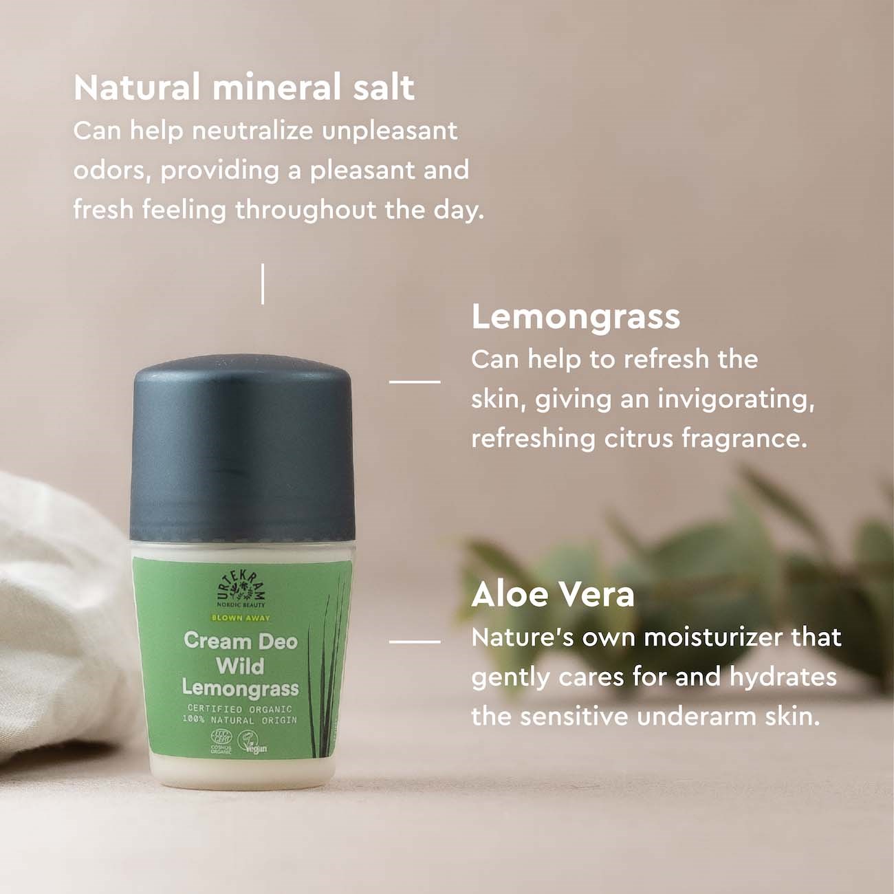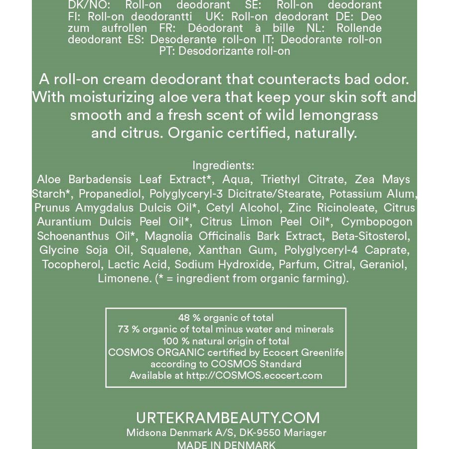 Urtekram Blown Away Cream Deo to kremowy dezodorant typu roll-on o świeżym zapachu dzikiej trawy cytrynowej i cytrusów, który skutecznie przeciwdziała przykremu zapachowi. Z nawilżającym aloesem, który utrzymuje skórę miękką i gładką. Certyfikowany przez Ecocert Cosmos Organic, w 100 % pochodzenia naturalnego i wegański