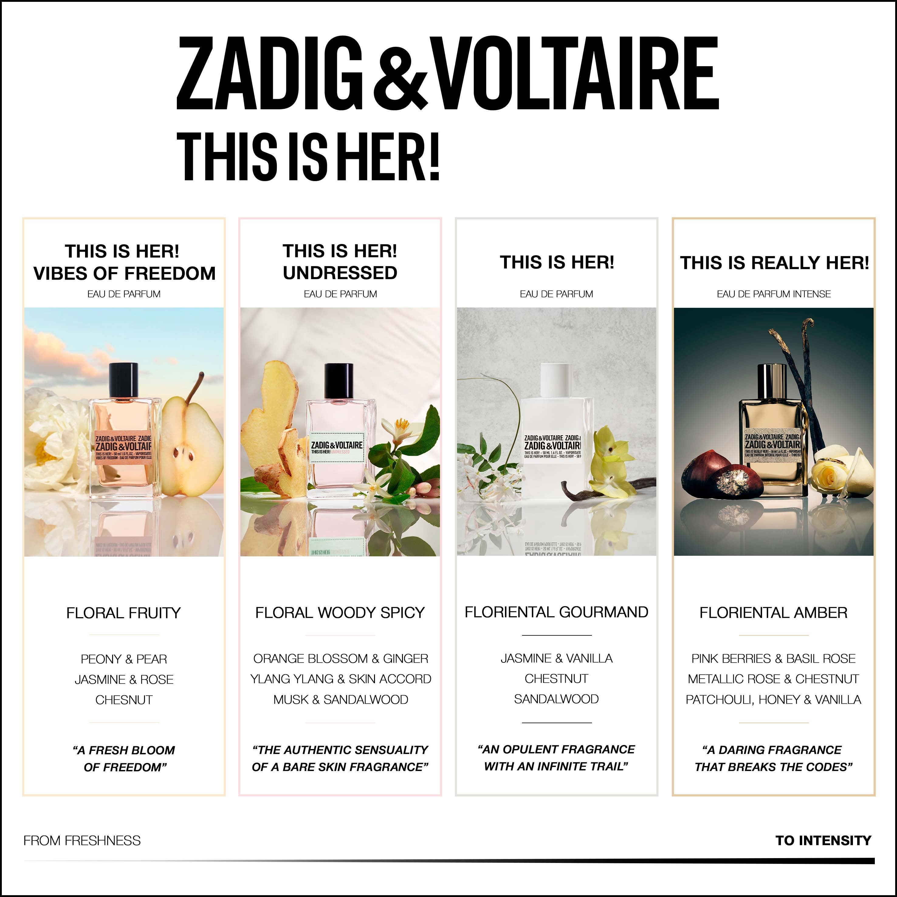 Zadig & Voltaire to marka, która łączy rockowy styl, sztukę i paryski szyk. Bądź sobą, poczuj wolność i zyskaj pewność siebie z tą zapachową petardą.This is Her! to kwiatowo-pikantny zapach z jaśminem i różowym pieprzem. Delikatny, ale z rockowym pazurem kasztana i benzoesu. Kobiecość podkręcona intensywną bazą z drzewa sandałowego.