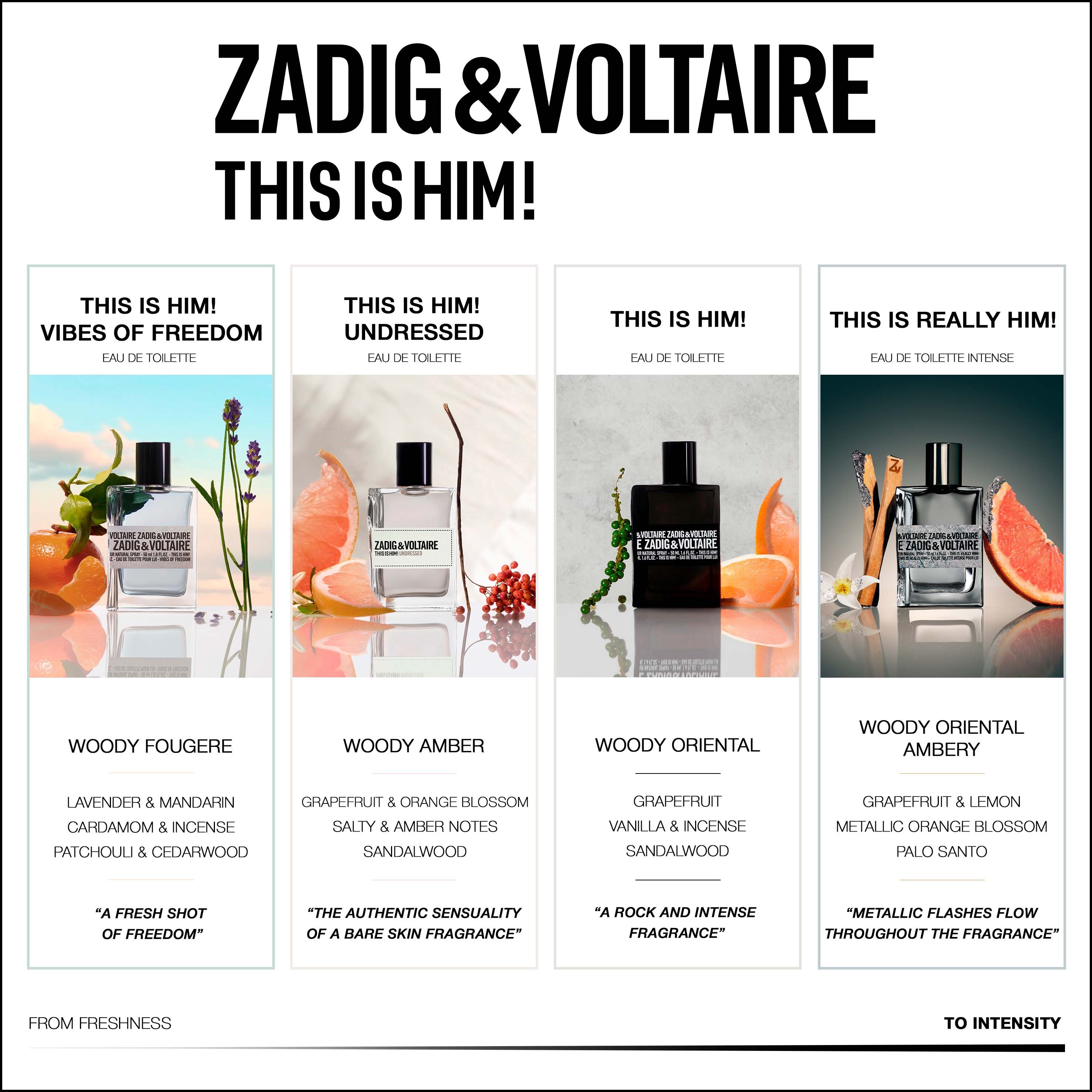 Him Freedom to orzeźwiający powiew wolności! Ten nowy, męski zapach od marki Zadig & Voltaire działa niczym świeży i aromatyczny zastrzyk pozytywnej energii! Na pierwszy rzut oka to pełen wdzięku i charyzmy mężczyzna, ale w głębi duszy jest nowoczesny i naturalny emanując mnóstwem pozytywnych wibracji. To tajemnicze, świeże perfumy, które przeniosą Cię na nowe wyżyny zapachowe. Drzewno-energetyczna kompozycja łączy nuty wibrującej lawendy i soczystej mandarynki na górze z kardamonem i kadzidłem w sercu. Nieodparta eksplozja przypraw, która występuje w tej wodzie toaletowej przechodzi w ciepłą i drzewną podstawę z paczuli i drzewa cedrowego. This is Him! Vibes of Freedom ma na celu podkreślenie, że instynkt Freedom wibruje głęboko w nas i rezonuje z naturą.